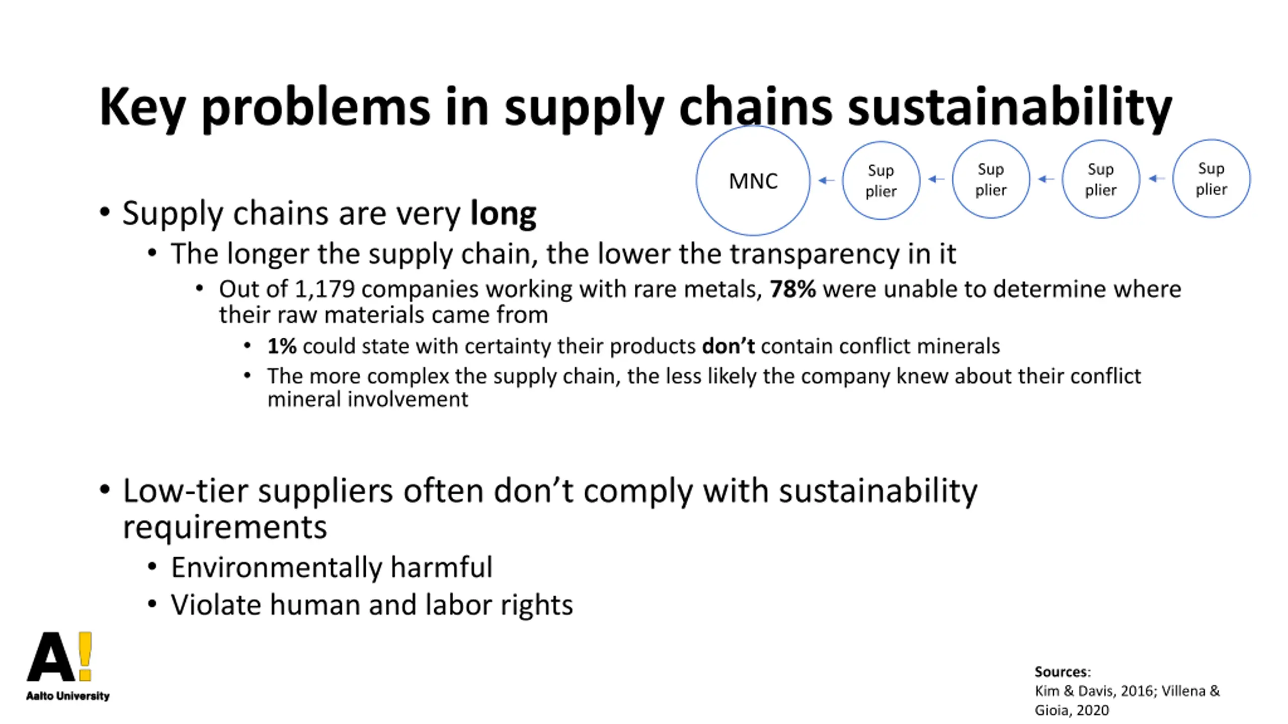 Key problems in supply chains sustainability Sup plier Sup plier Sup plier Sup plier MNC Supply chains are very long The longer the supply chain, the lower the transparency in it Out of 1,179 companies working with rare metals, 78% were unable to determine where their raw materials came from 1% could state with certainty their products don t contain conflict minerals The more complex the supply chain, the less likely the company knew about their conflict mineral involvement Low-tier suppliers often don t comply with sustainability requirements Environmentally harmful Violate human and labor rights Sources: Kim & Davis, 2016; Villena & Gioia, 2020