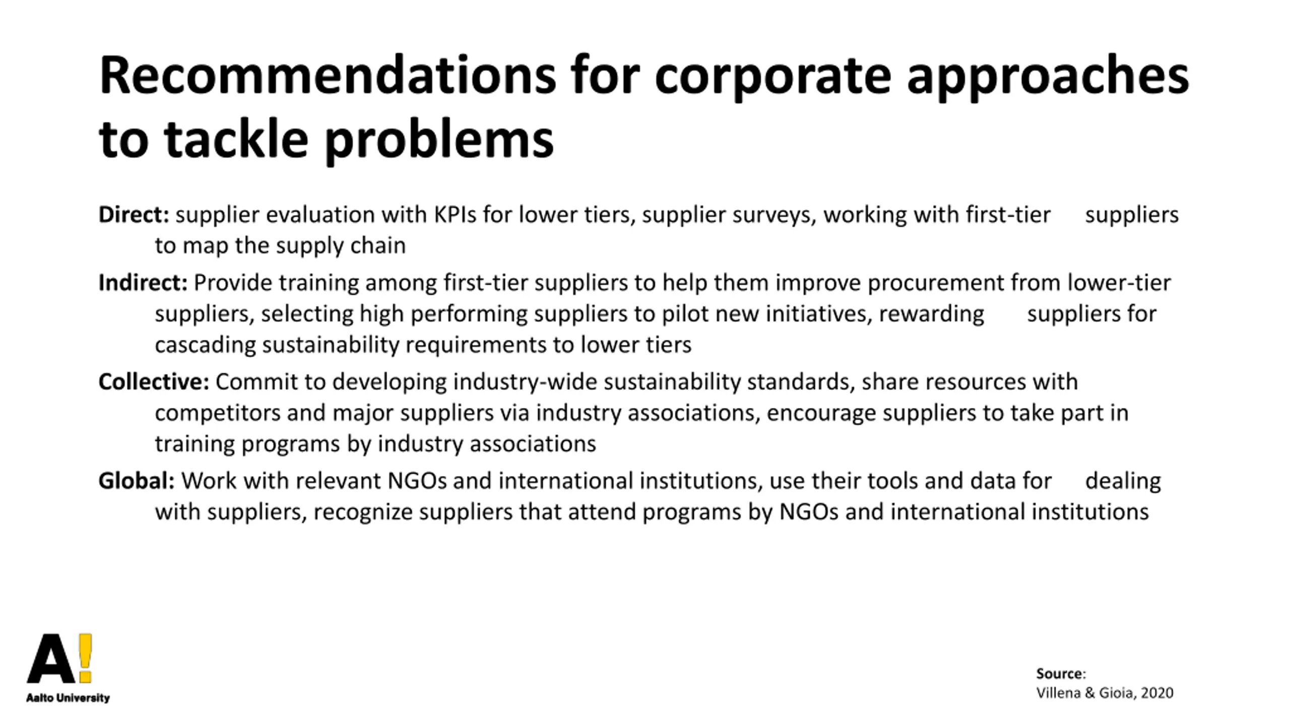 Recommendations for corporate approaches to tackle problems Direct: supplier evaluation with KPIs for lower tiers, supplier surveys, working with first-tier to map the supply chain Indirect: Provide training among first-tier suppliers to help them improve procurement from lower-tier suppliers, selecting high performing suppliers to pilot new initiatives, rewarding cascading sustainability requirements to lower tiers Collective: Commit to developing industry-wide sustainability standards, share resources with competitors and major suppliers via industry associations, encourage suppliers to take part in training programs by industry associations Global: Work with relevant NGOs and international institutions, use their tools and data for with suppliers, recognize suppliers that attend programs by NGOs and international institutions suppliers suppliers for dealing Source: Villena & Gioia, 2020