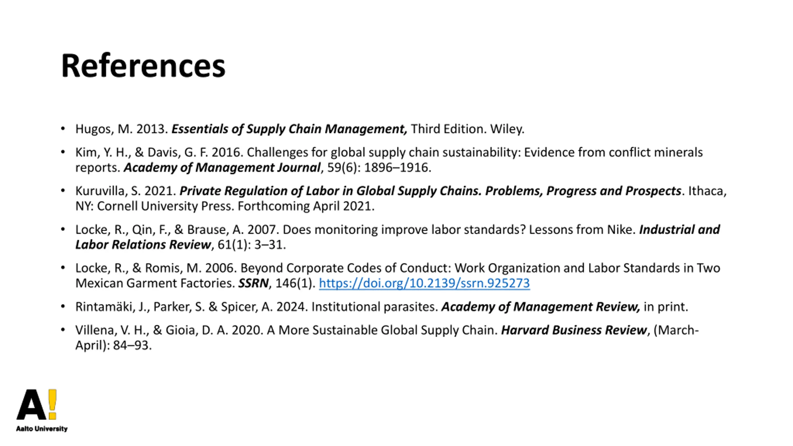 References Hugos, M. 2013. Essentials of Supply Chain Management, Third Edition. Wiley. Kim, Y. H., & Davis, G. F. 2016. Challenges for global supply chain sustainability: Evidence from conflict minerals reports. Academy of Management Journal, 59(6): 1896 1916. Kuruvilla, S. 2021. Private Regulation of Labor in Global Supply Chains. Problems, Progress and Prospects. Ithaca, NY: Cornell University Press. Forthcoming April 2021. Locke, R., Qin, F., & Brause, A. 2007. Does monitoring improve labor standards? Lessons from Nike. Industrial and Labor Relations Review, 61(1): 3 31. Locke, R., & Romis, M. 2006. Beyond Corporate Codes of Conduct: Work Organization and Labor Standards in Two Mexican Garment Factories. SSRN, 146(1). https://doi.org/10.2139/ssrn.925273 Rintam ki, J., Parker, S. & Spicer, A. 2024. Institutional parasites. Academy of Management Review, in print. Villena, V. H., & Gioia, D. A. 2020. A More Sustainable Global Supply Chain. Harvard Business Review, (March- April): 84 93.