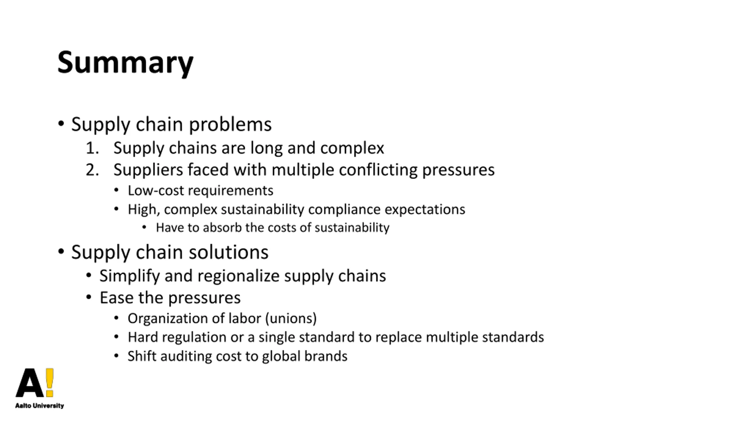 Summary Supply chain problems 1. Supply chains are long and complex 2. Suppliers faced with multiple conflicting pressures Low-cost requirements High, complex sustainability compliance expectations Have to absorb the costs of sustainability Supply chain solutions Simplify and regionalize supply chains Ease the pressures Organization of labor (unions) Hard regulation or a single standard to replace multiple standards Shift auditing cost to global brands