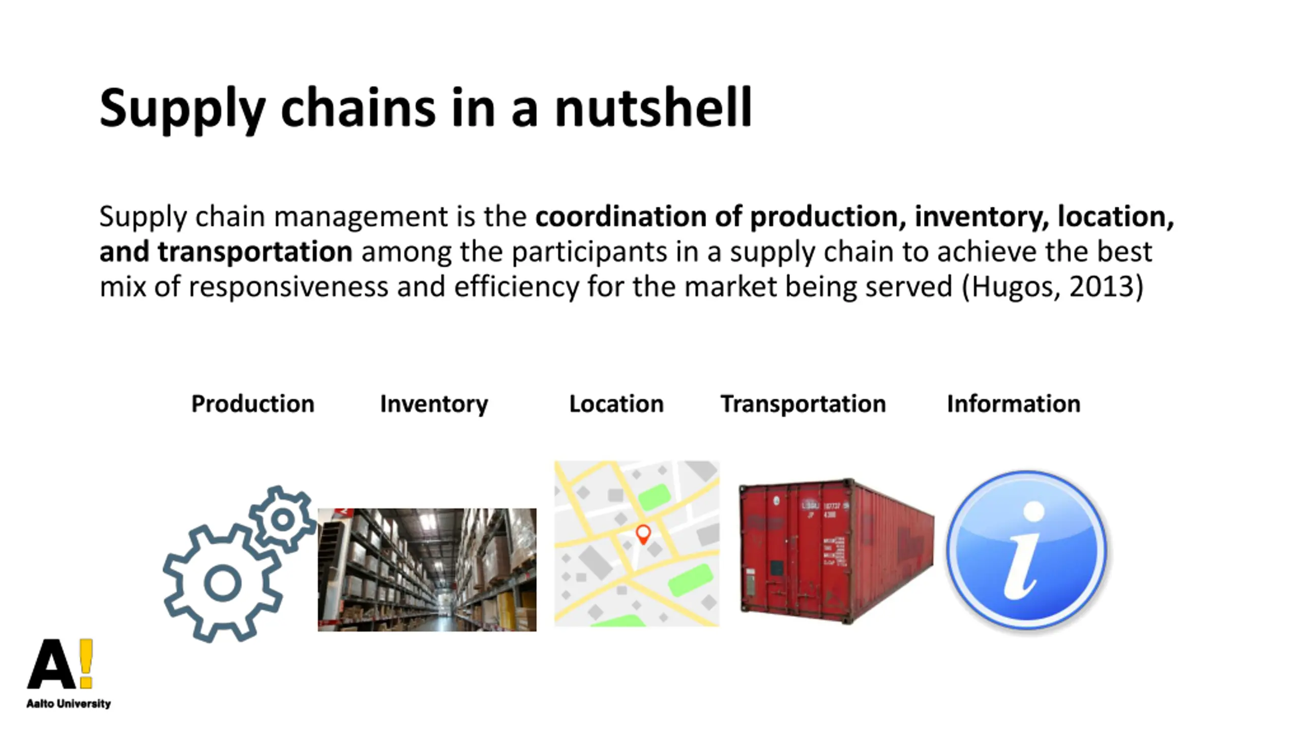 Supply chains in a nutshell Supply chain management is the coordination of production, inventory, location, and transportation among the participants in a supply chain to achieve the best mix of responsiveness and efficiency for the market being served (Hugos, 2013) Production Inventory Location Transportation Information