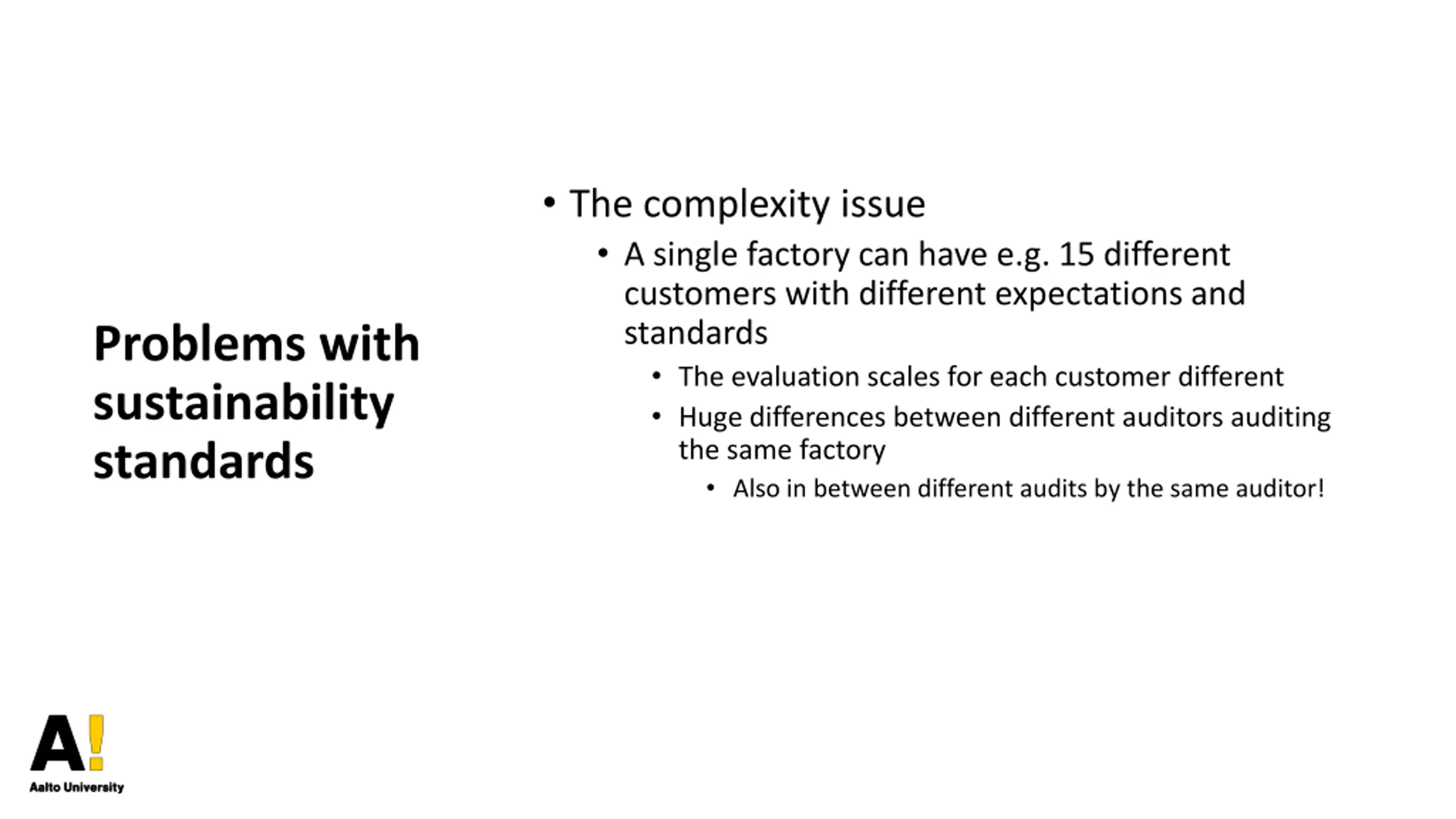 The complexity issue A single factory can have e.g. 15 different customers with different expectations and standards The evaluation scales for each customer different Huge differences between different auditors auditing the same factory Also in between different audits by the same auditor! Problems with sustainability standards