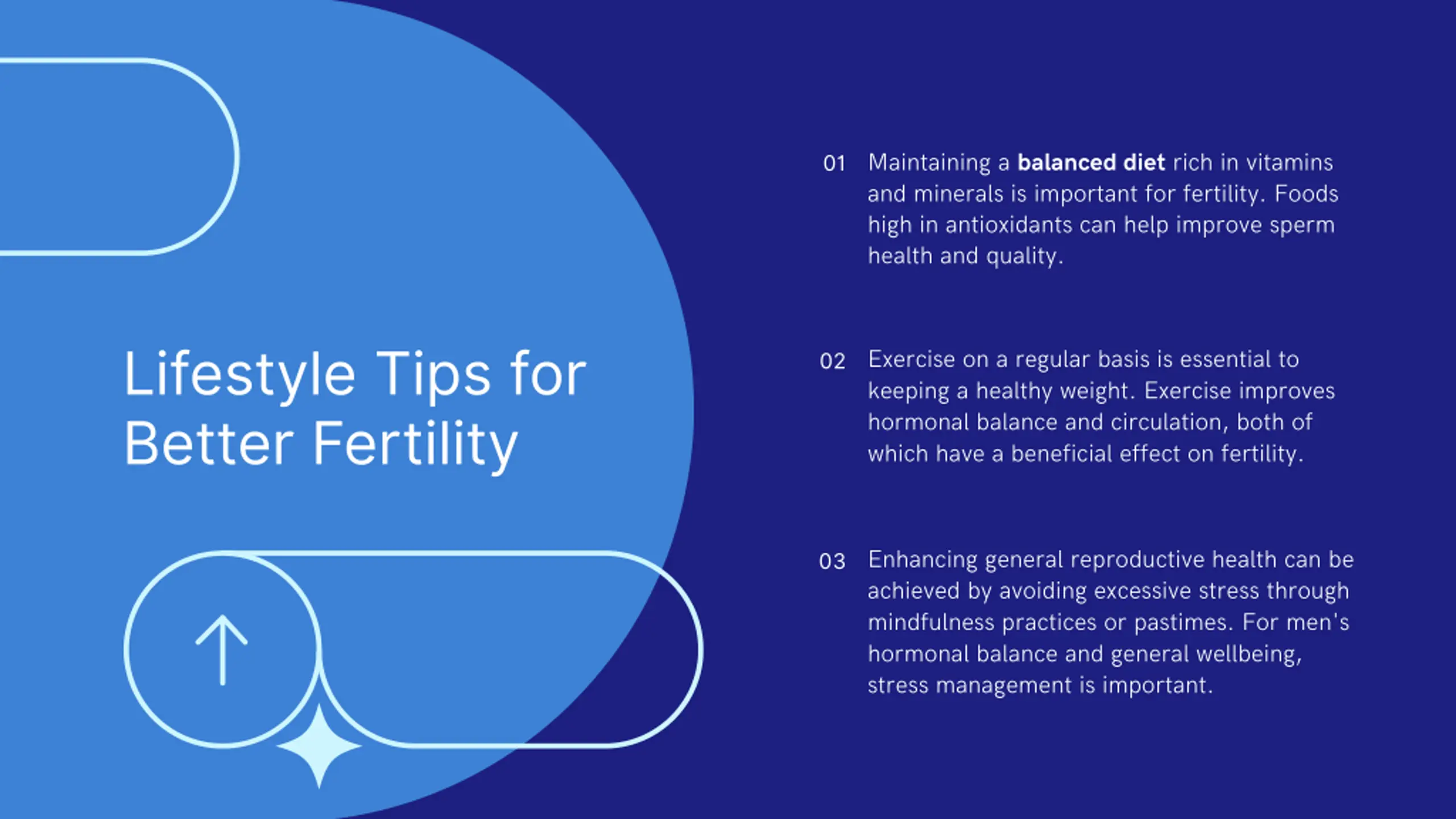 01 Maintaining a balanced diet rich in vitamins and minerals is important for fertility. Foods high in antioxidants can help improve sperm health and quality. Lifestyle Tips for Better Fertility 02 Exercise on a regular basis is essential to keeping a healthy weight. Exercise improves hormonal balance and circulation, both of which have a beneficial effect on fertility. 03 Enhancing general reproductive health can be achieved by avoiding excessive stress through mindfulness practices or pastimes. For men's hormonal balance and general wellbeing, stress management is important.