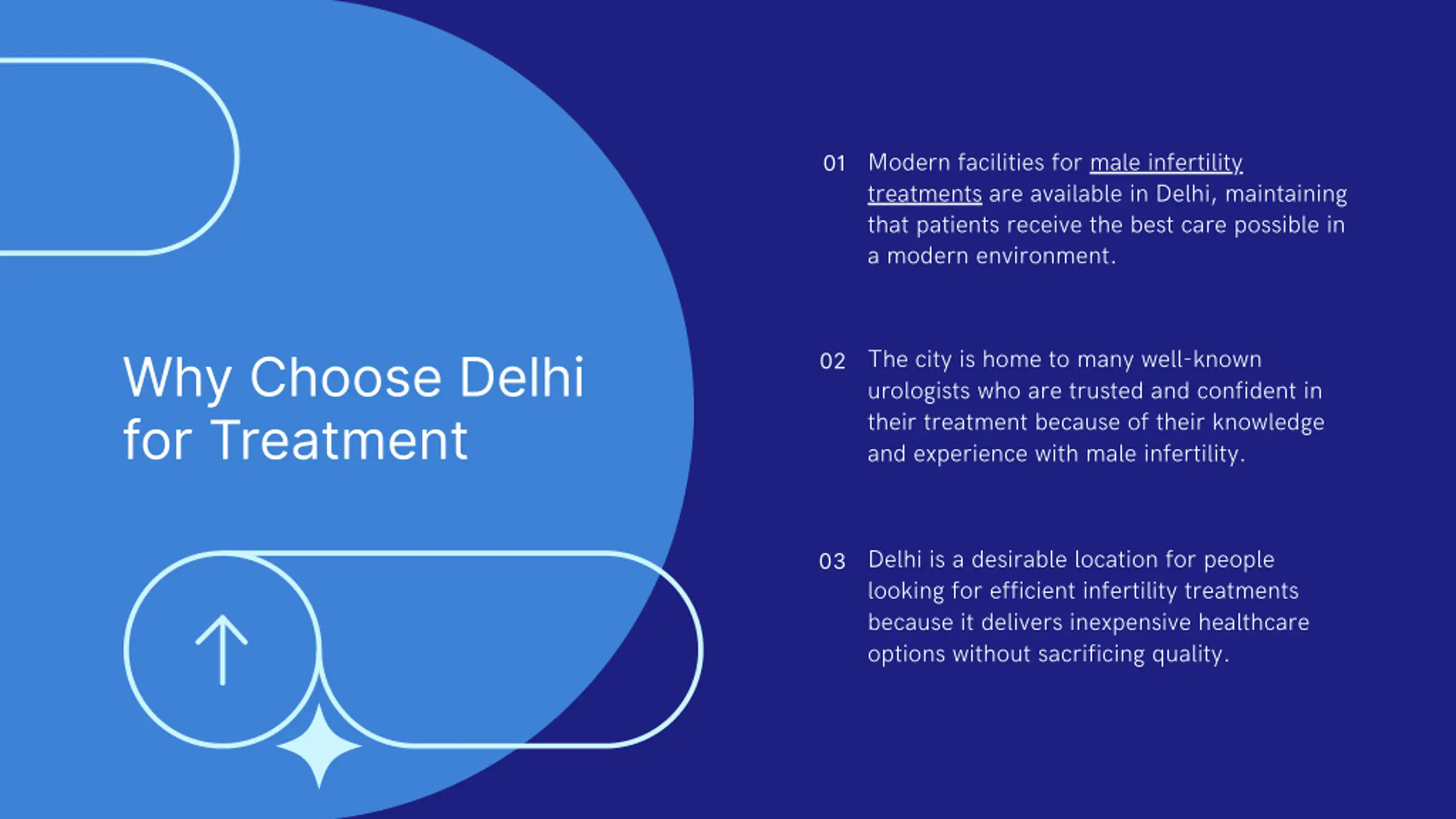 01 Modern facilities for male infertility treatments are available in Delhi, maintaining that patients receive the best care possible in a modern environment. Why Choose Delhi for Treatment 02 The city is home to many well-known urologists who are trusted and confident in their treatment because of their knowledge and experience with male infertility. 03 Delhi is a desirable location for people looking for efficient infertility treatments because it delivers inexpensive healthcare options without sacrificing quality.