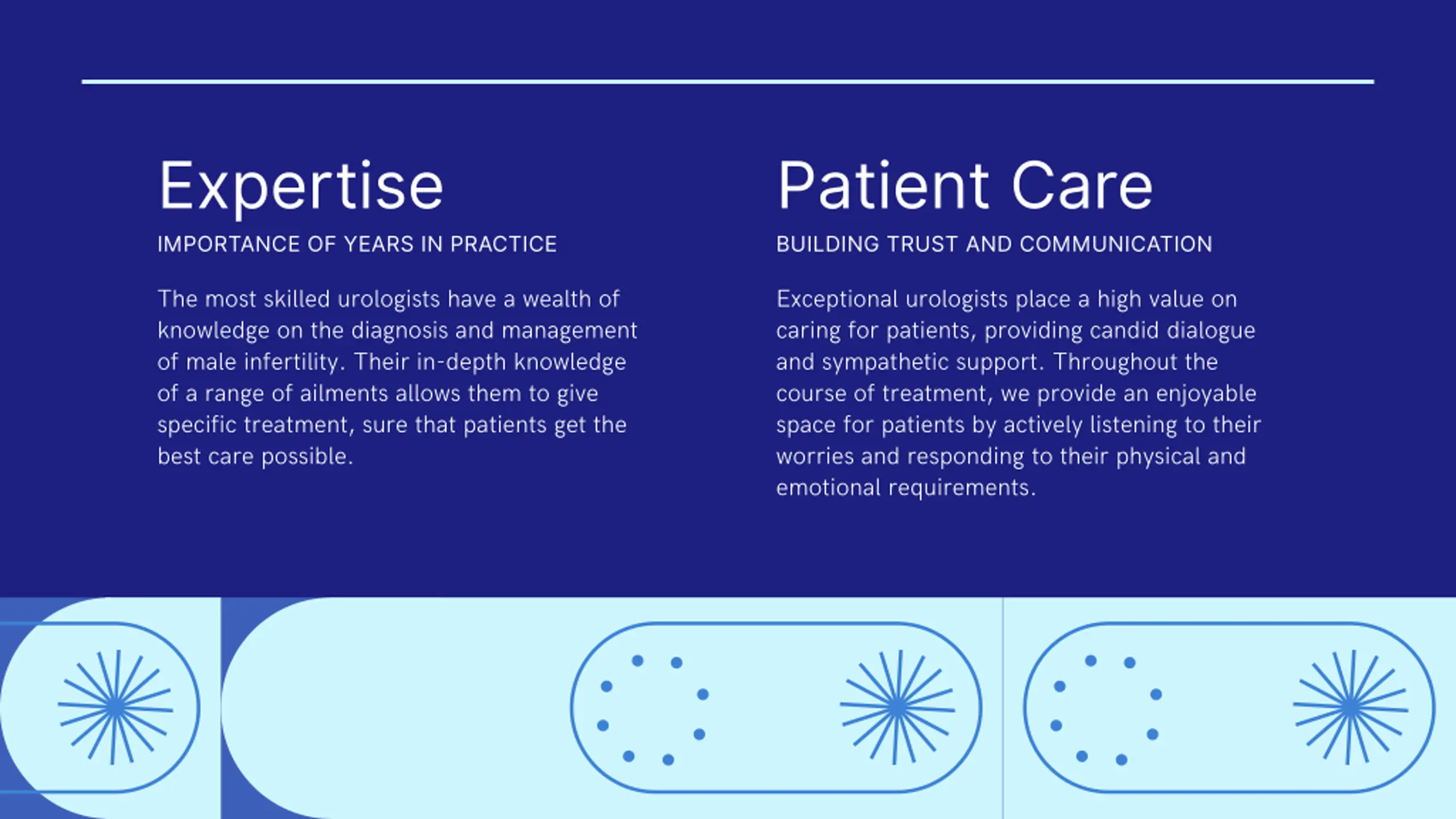 Expertise IMPORTANCE OF YEARS IN PRACTICE Patient Care BUILDING TRUST AND COMMUNICATION Exceptional urologists place a high value on caring for patients, providing candid dialogue and sympathetic support. Throughout the course of treatment, we provide an enjoyable space for patients by actively listening to their worries and responding to their physical and emotional requirements. The most skilled urologists have a wealth of knowledge on the diagnosis and management of male infertility. Their in-depth knowledge of a range of ailments allows them to give specific treatment, sure that patients get the best care possible.