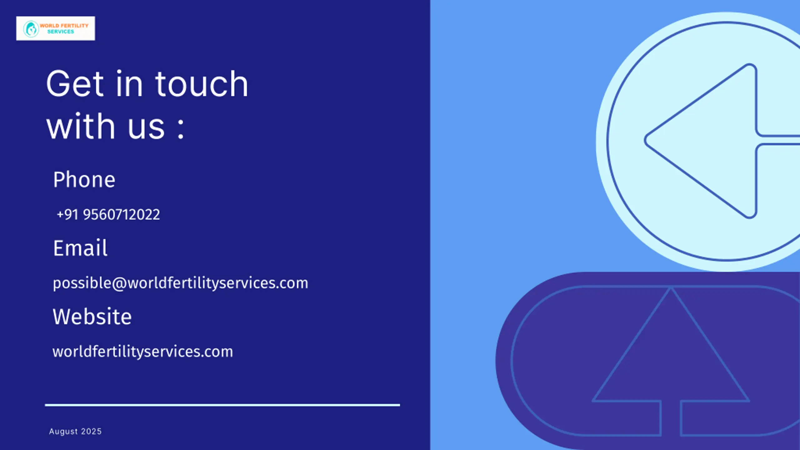 Get in touch with us : Phone +91 9560712022 Email possible@worldfertilityservices.com Website worldfertilityservices.com August 2025