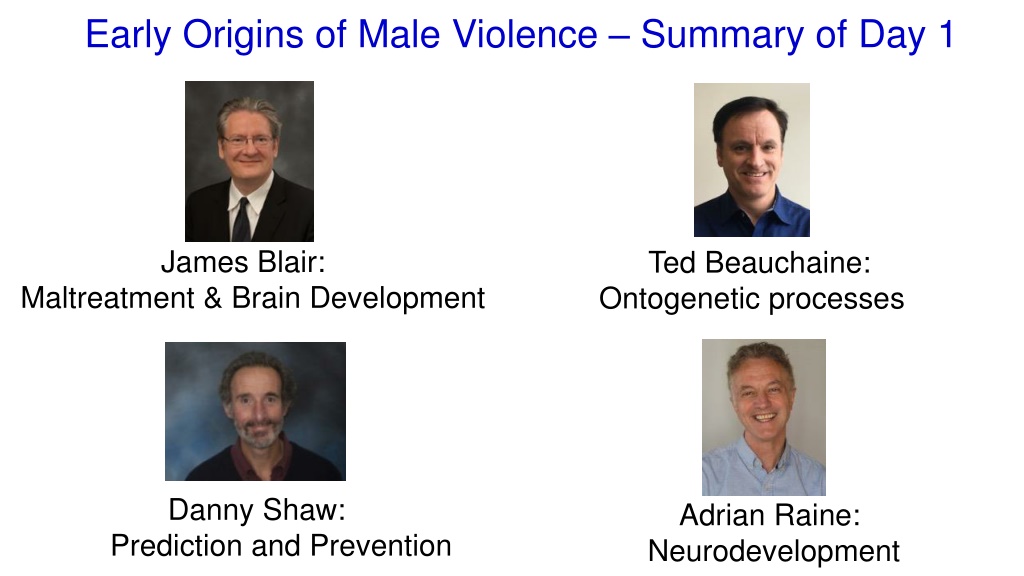 Early Origins of Male Violence Summary of Day 1 James Blair: Ted Beauchaine: Ontogenetic processes Maltreatment & Brain Development Danny Shaw: Prediction and Prevention Adrian Raine: Neurodevelopment