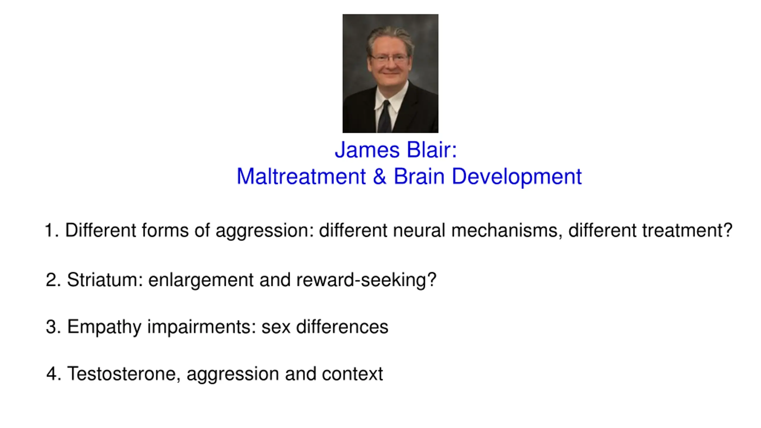 James Blair: Maltreatment & Brain Development 1. Different forms of aggression: different neural mechanisms, different treatment? 2. Striatum: enlargement and reward-seeking? 3. Empathy impairments: sex differences 4. Testosterone, aggression and context