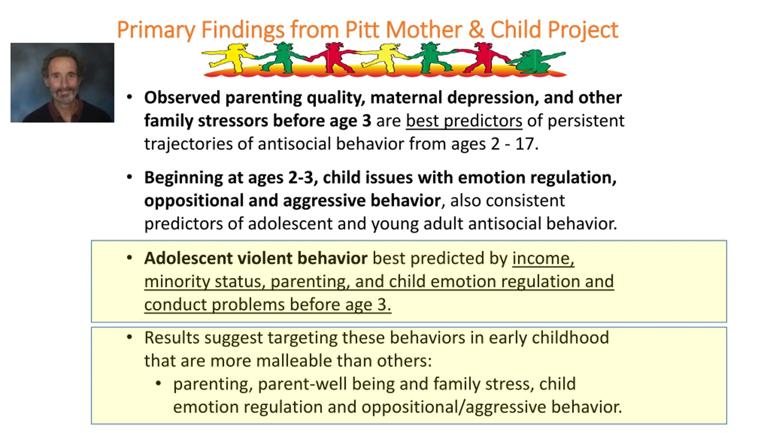 Primary Findings from Pitt Mother & Child Project Primary Findings from Pitt Mother & Child Project Observed parenting quality, maternal depression, and other family stressors before age 3 are best predictors of persistent trajectories of antisocial behavior from ages 2 - 17. Beginning at ages 2-3, child issues with emotion regulation, oppositional and aggressive behavior, also consistent predictors of adolescent and young adult antisocial behavior. Adolescent violent behavior best predicted by income, minority status, parenting, and child emotion regulation and conduct problems before age 3. Results suggest targeting these behaviors in early childhood that are more malleable than others: parenting, parent-well being and family stress, child emotion regulation and oppositional/aggressive behavior.