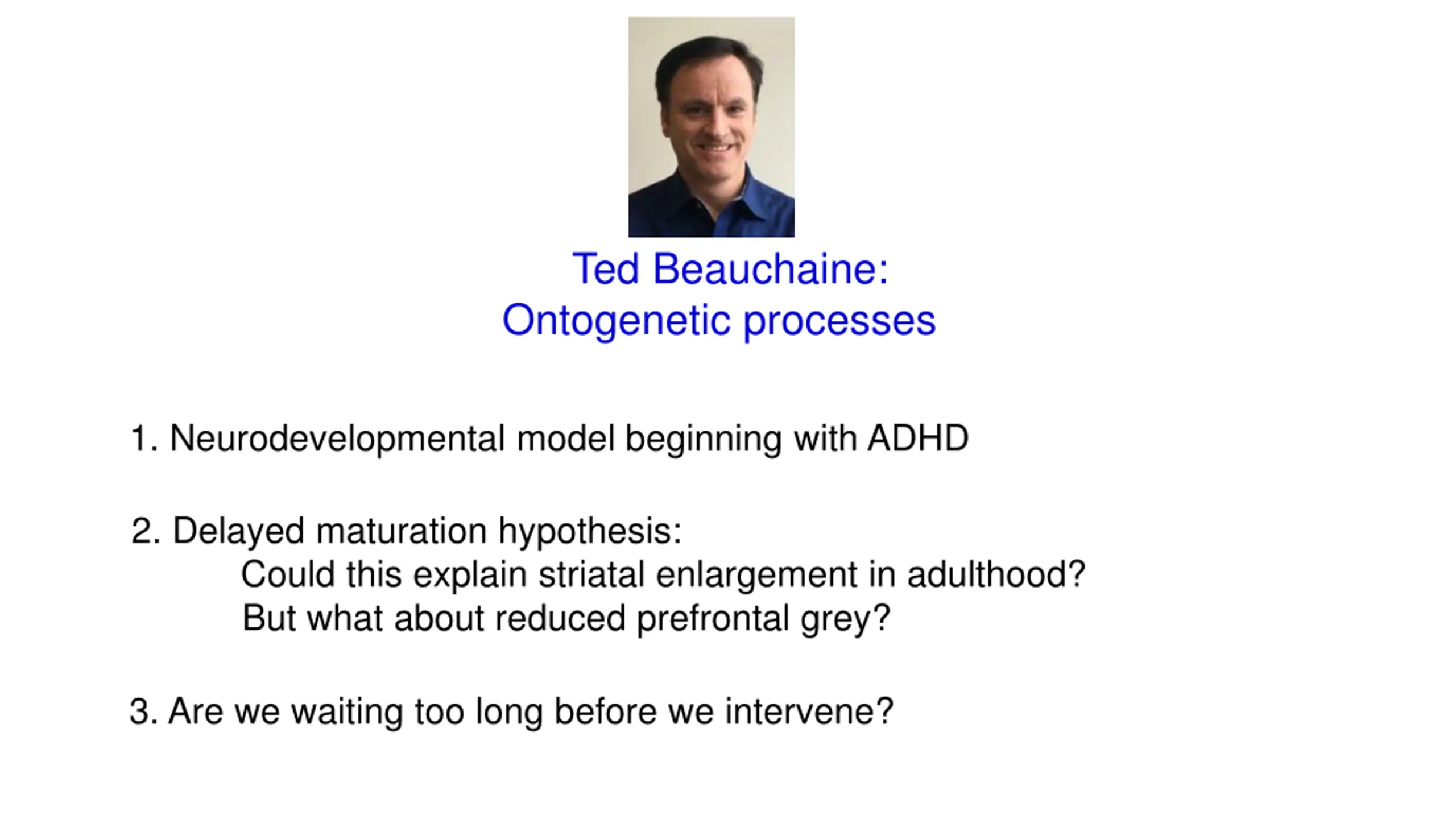 Ted Beauchaine: Ontogenetic processes 1. Neurodevelopmental model beginning with ADHD 2. Delayed maturation hypothesis: Could this explain striatal enlargement in adulthood? But what about reduced prefrontal grey? 3. Are we waiting too long before we intervene?