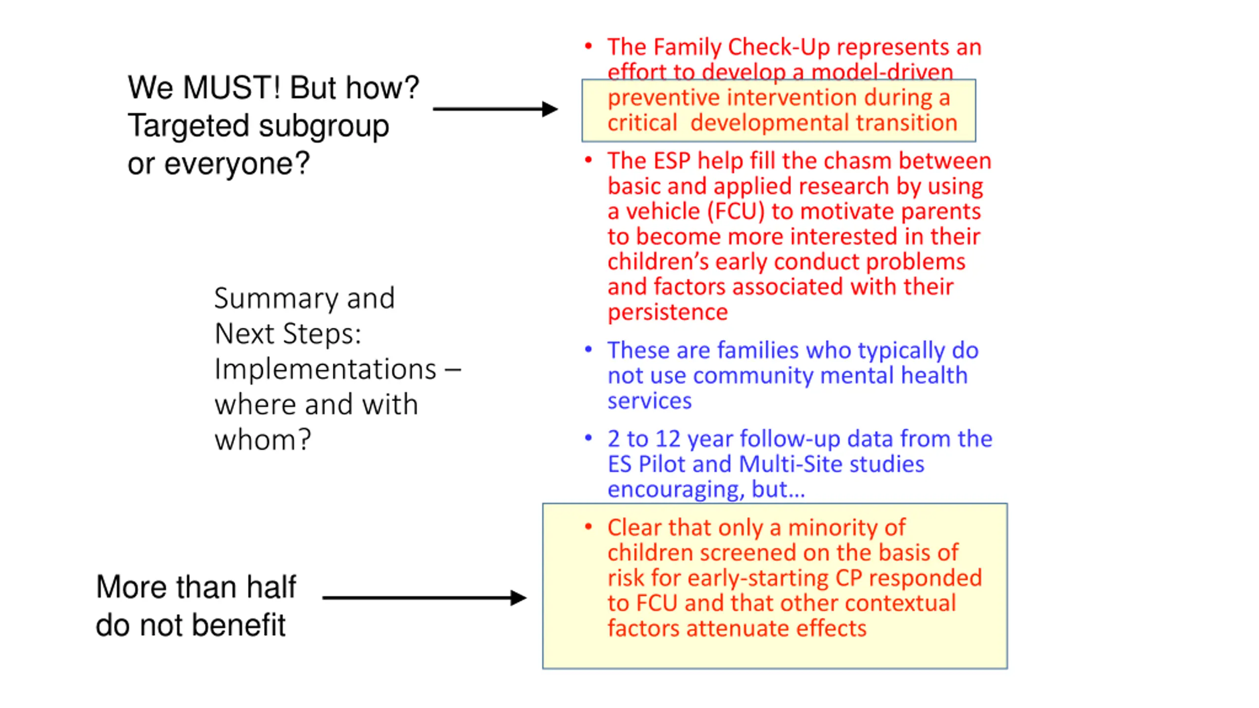 The Family Check-Up represents an effort to develop a model-driven preventive intervention during a critical developmental transition The ESP help fill the chasm between basic and applied research by using a vehicle (FCU) to motivate parents to become more interested in their children s early conduct problems and factors associated with their persistence These are families who typically do not use community mental health services 2 to 12 year follow-up data from the ES Pilot and Multi-Site studies encouraging, but Clear that only a minority of children screened on the basis of risk for early-starting CP responded to FCU and that other contextual factors attenuate effects We MUST! But how? Targeted subgroup or everyone? Summary and Next Steps: Implementations where and with whom? More than half do not benefit