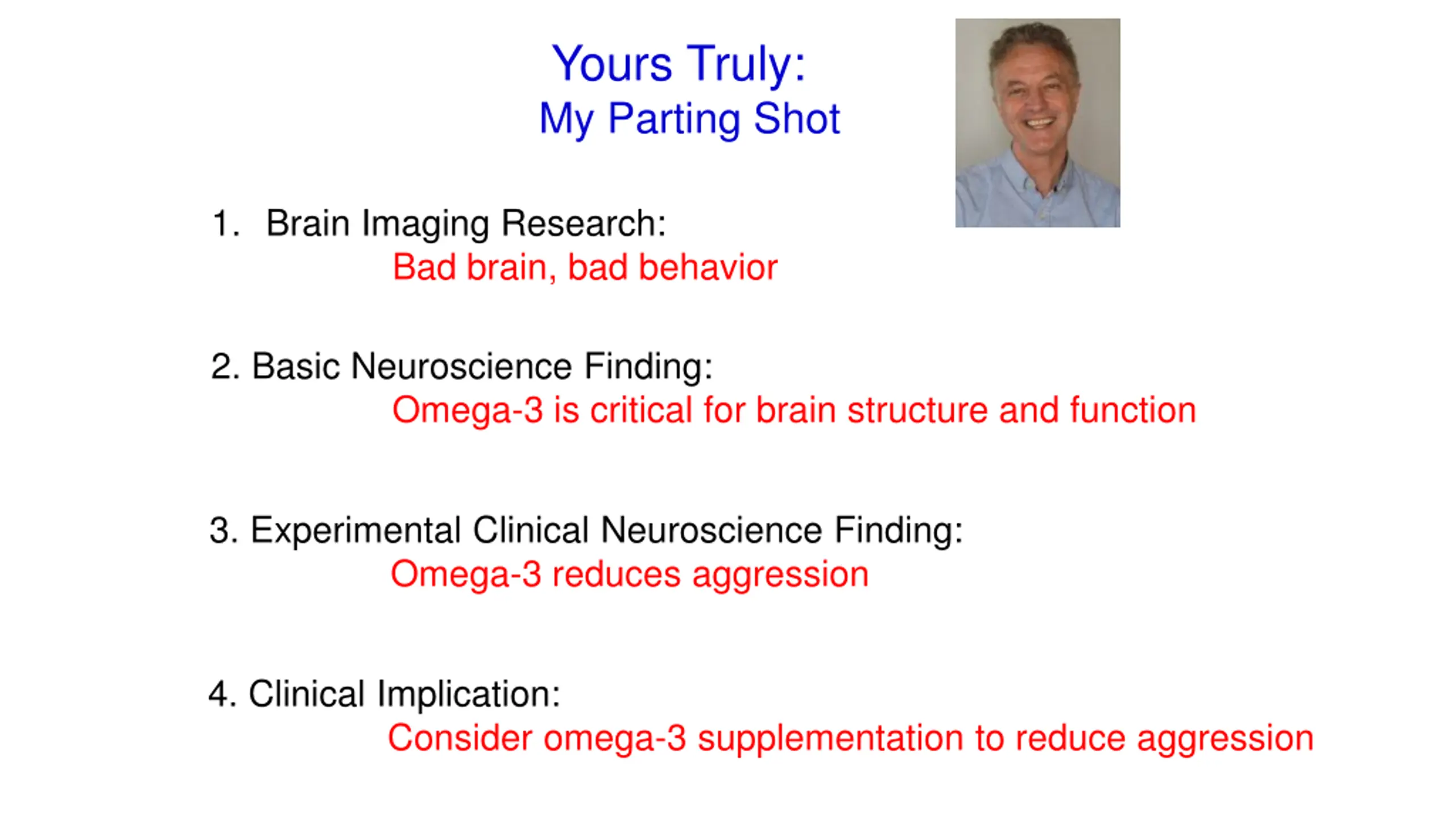 Yours Truly: My Parting Shot 1. Brain Imaging Research: Bad brain, bad behavior 2. Basic Neuroscience Finding: Omega-3 is critical for brain structure and function 3. Experimental Clinical Neuroscience Finding: Omega-3 reduces aggression 4. Clinical Implication: Consider omega-3 supplementation to reduce aggression