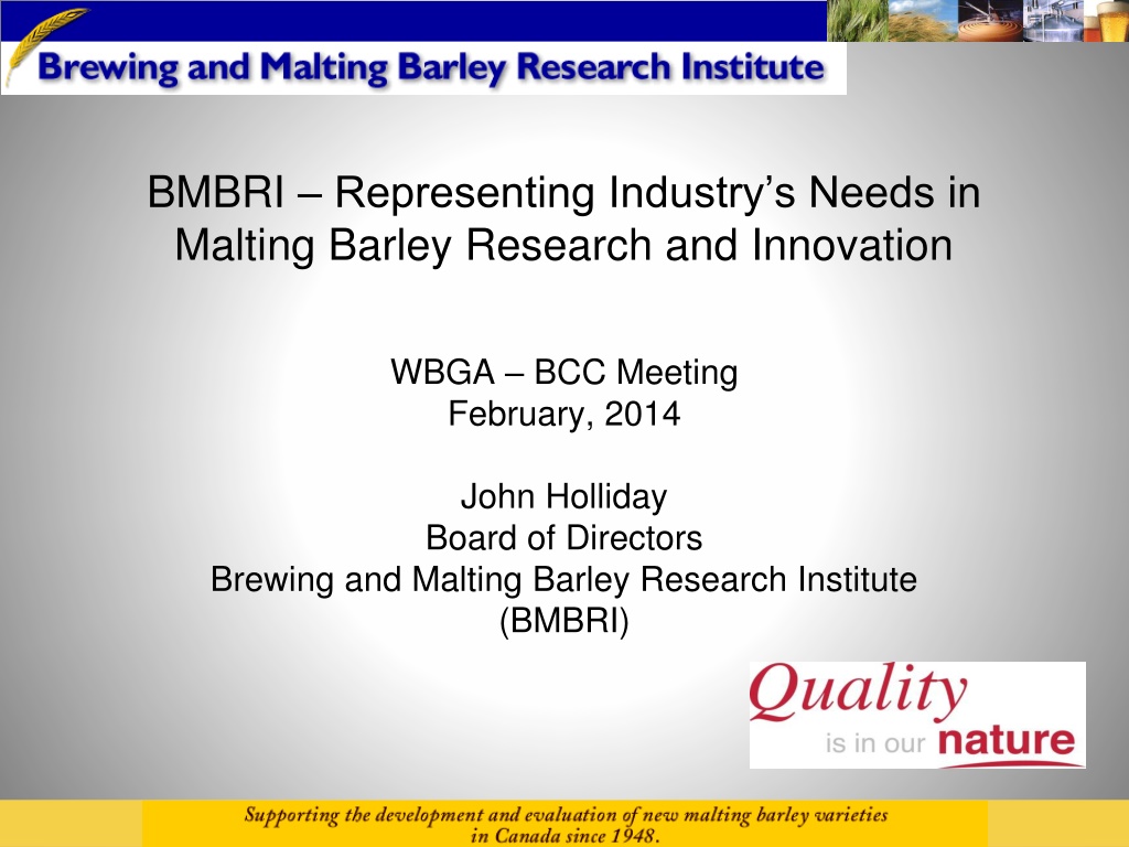 BMBRI BMBRI Representing Industry s Needs in Representing Industry s Needs in Canadian Malting Barley Innovation Canadian Malting Barley Innovation WBGA BCC Annual Meeting February, 2014 John Holliday Board of Directors Brewing and Malting Barley Research Institute (BMBRI)