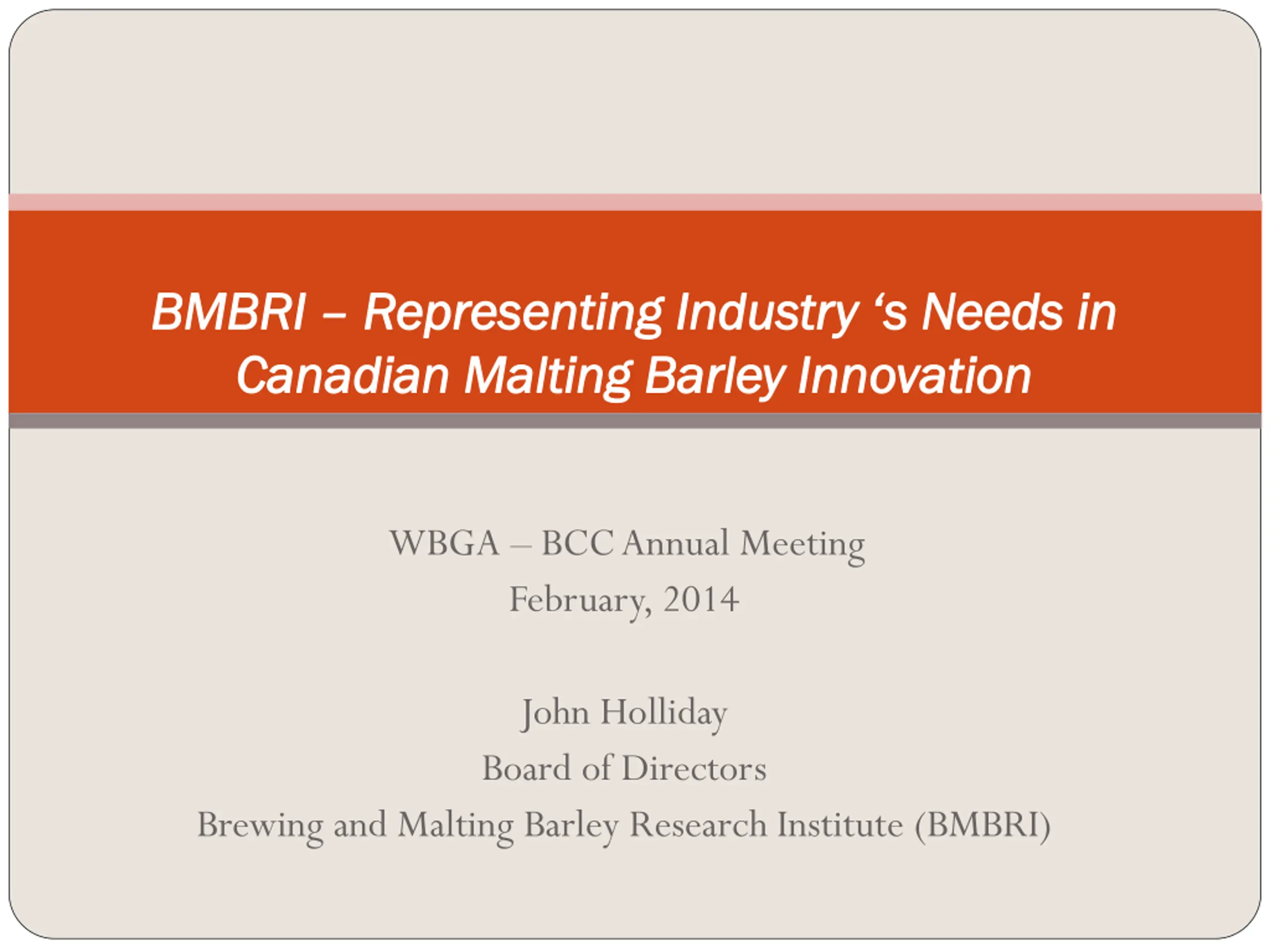 BMBRI Representing Industrys Needs in Malting Barley Research and Innovation WBGA BCC Meeting February, 2014 John Holliday Board of Directors Brewing and Malting Barley Research Institute (BMBRI)
