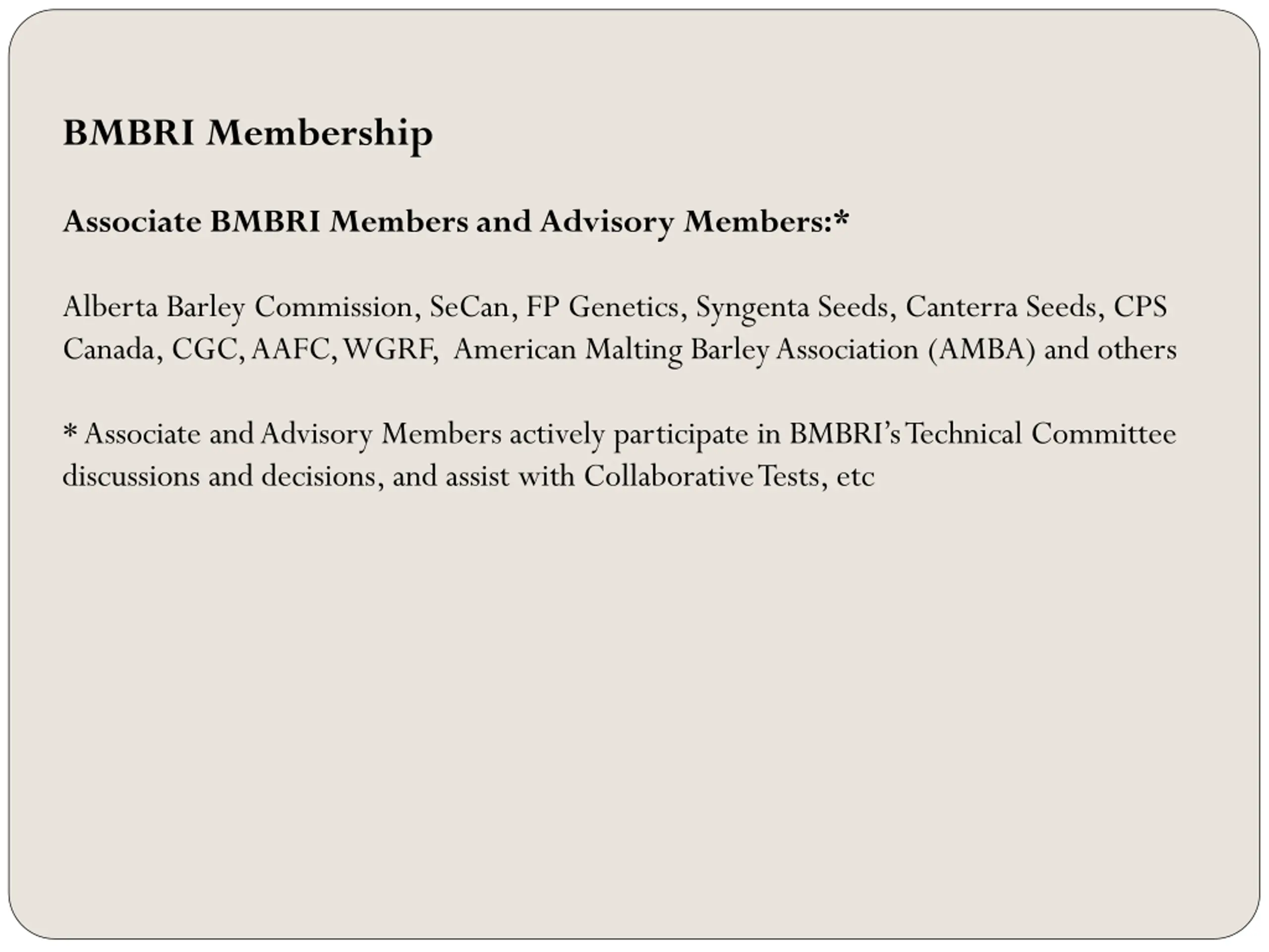 BMBRI Membership Associate BMBRI Members and Advisory Members:* Alberta Barley Commission, SeCan, FP Genetics, Syngenta Seeds, Canterra Seeds, CPS Canada, CGC, AAFC, WGRF, American Malting Barley Association (AMBA) and others * Associate and Advisory Members actively participate in BMBRI s Technical Committee discussions and decisions, and assist with Collaborative Tests, etc