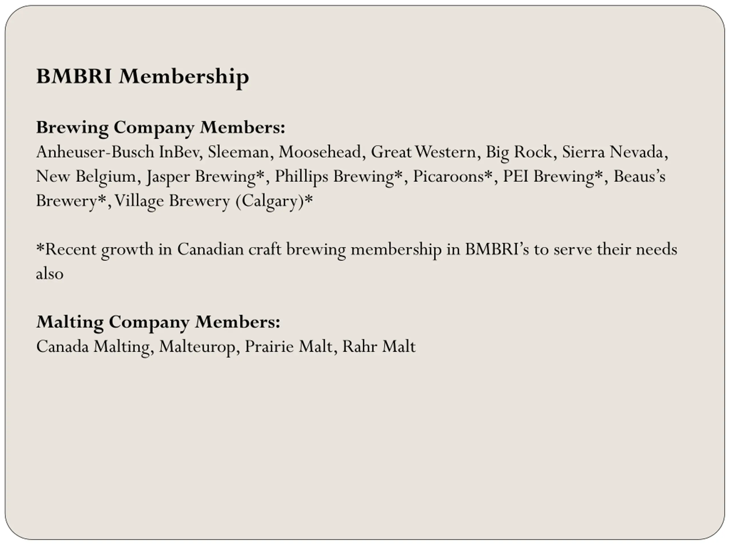 BMBRI Membership Brewing Company Members: Anheuser-Busch InBev, Sleeman, Moosehead, Great Western, Big Rock, Sierra Nevada, New Belgium, Jasper Brewing*, Phillips Brewing*, Picaroons*, PEI Brewing*, Beaus s Brewery*, Village Brewery (Calgary)* *Recent growth in Canadian craft brewing membership in BMBRI s to serve their needs also Malting Company Members: Canada Malting, Malteurop, Prairie Malt, Rahr Malt
