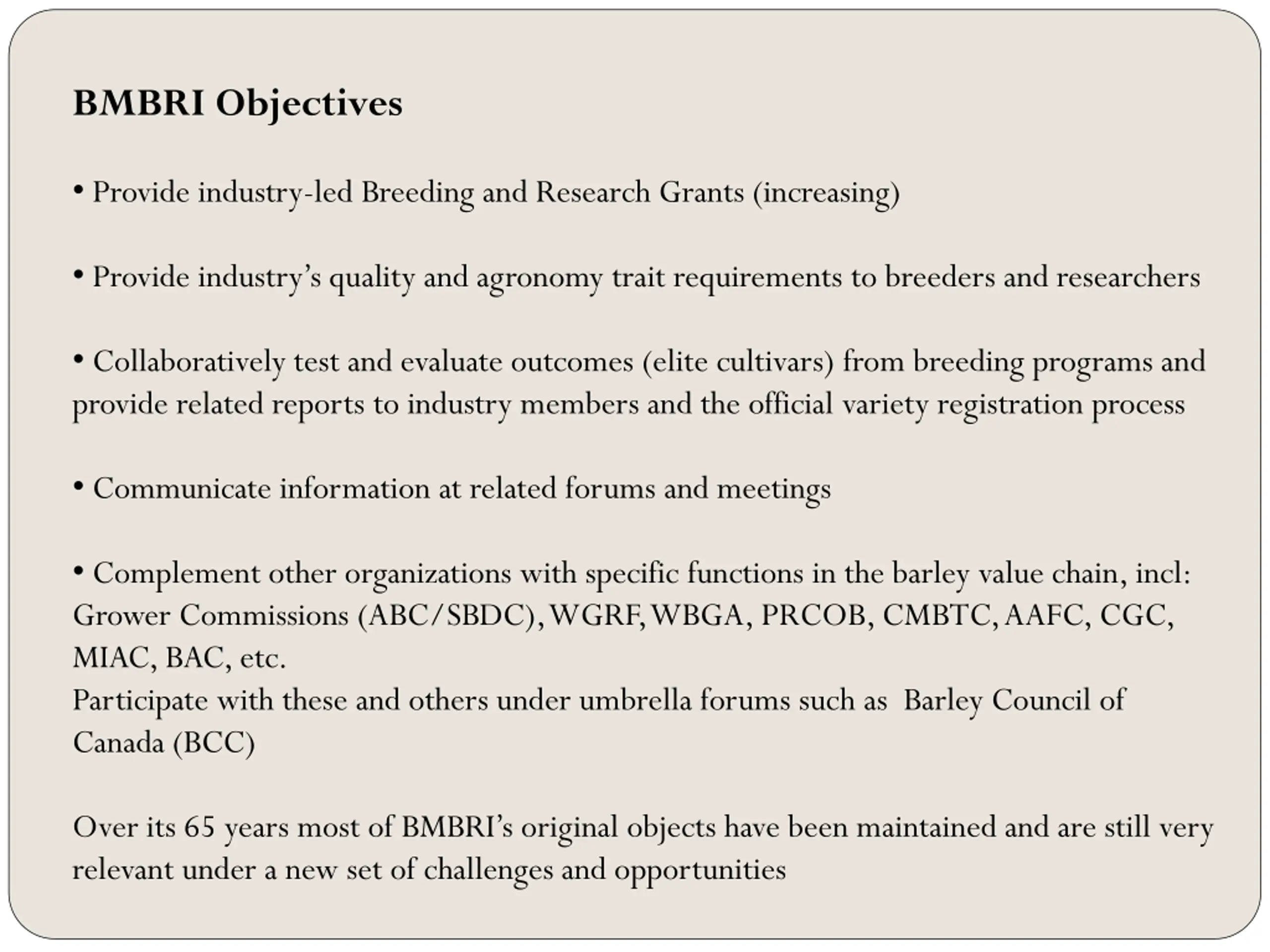 BMBRI Objectives Provide industry-led Breeding and Research Grants (increasing) Provide industry s quality and agronomy trait requirements to breeders and researchers Collaboratively test and evaluate outcomes (elite cultivars) from breeding programs and provide related reports to industry members and the official variety registration process Communicate information at related forums and meetings Complement other organizations with specific functions in the barley value chain, incl: Grower Commissions (ABC/SBDC), WGRF, WBGA, PRCOB, CMBTC, AAFC, CGC, MIAC, BAC, etc. Participate with these and others under umbrella forums such as Barley Council of Canada (BCC) Over its 65 years most of BMBRI s original objects have been maintained and are still very relevant under a new set of challenges and opportunities