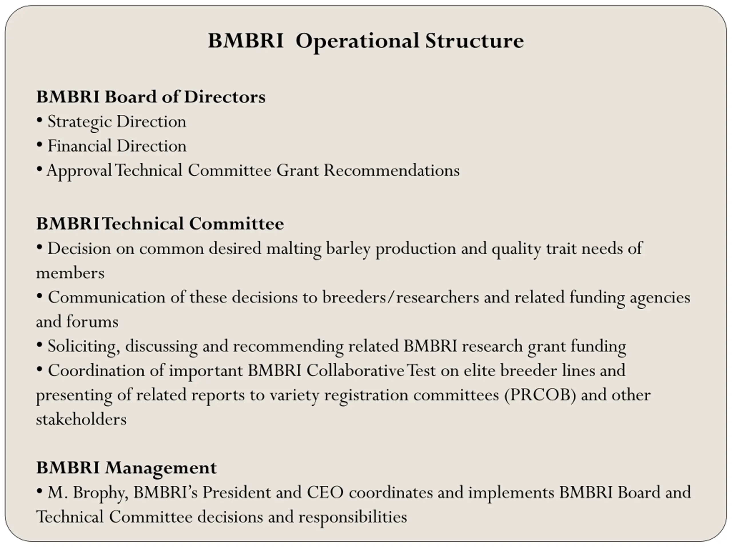 BMBRI Operational Structure BMBRI Board of Directors Strategic Direction Financial Direction Approval Technical Committee Grant Recommendations BMBRI Technical Committee Decision on common desired malting barley production and quality trait needs of members Communication of these decisions to breeders/researchers and related funding agencies and forums Soliciting, discussing and recommending related BMBRI research grant funding Coordination of important BMBRI Collaborative Test on elite breeder lines and presenting of related reports to variety registration committees (PRCOB) and other stakeholders BMBRI Management M. Brophy, BMBRI s President and CEO coordinates and implements BMBRI Board and Technical Committee decisions and responsibilities