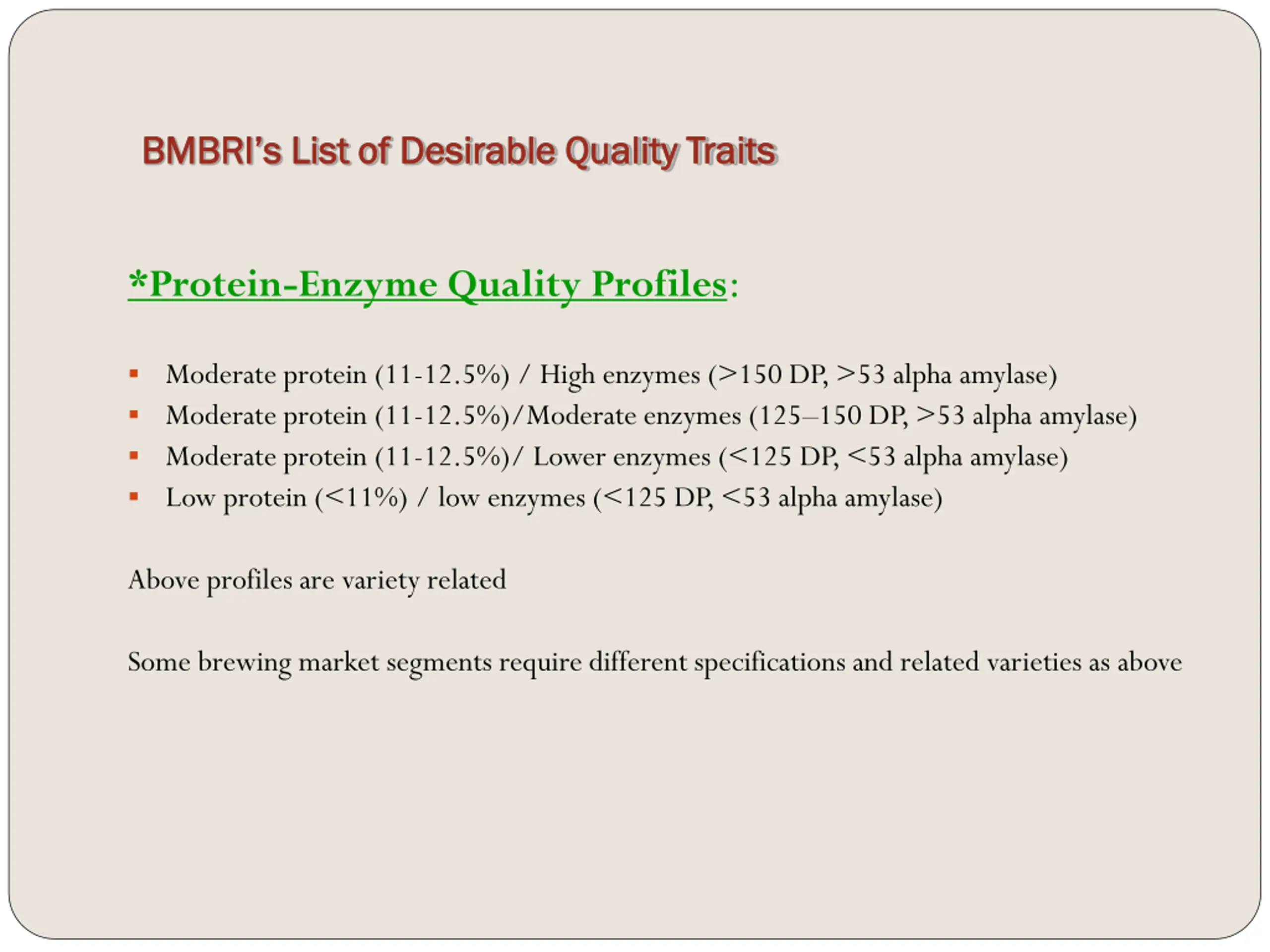 BMBRIs List of Desirable Quality Traits BMBRI s List of Desirable Quality Traits *Protein-Enzyme Quality Profiles: Moderate protein (11-12.5%) / High enzymes (>150 DP, >53 alpha amylase) Moderate protein (11-12.5%)/Moderate enzymes (125 150 DP, >53 alpha amylase) Moderate protein (11-12.5%)/ Lower enzymes (<125 DP, <53 alpha amylase) Low protein (<11%) / low enzymes (<125 DP, <53 alpha amylase) Above profiles are variety related Some brewing market segments require different specifications and related varieties as above