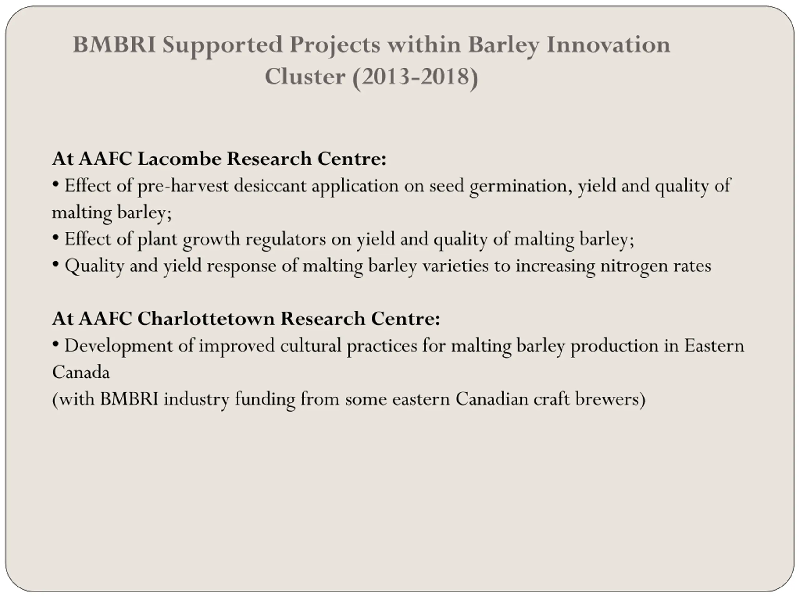 BMBRI Supported Projects within Barley Innovation Cluster (2013-2018) At AAFC Lacombe Research Centre: Effect of pre-harvest desiccant application on seed germination, yield and quality of malting barley; Effect of plant growth regulators on yield and quality of malting barley; Quality and yield response of malting barley varieties to increasing nitrogen rates At AAFC Charlottetown Research Centre: Development of improved cultural practices for malting barley production in Eastern Canada (with BMBRI industry funding from some eastern Canadian craft brewers)