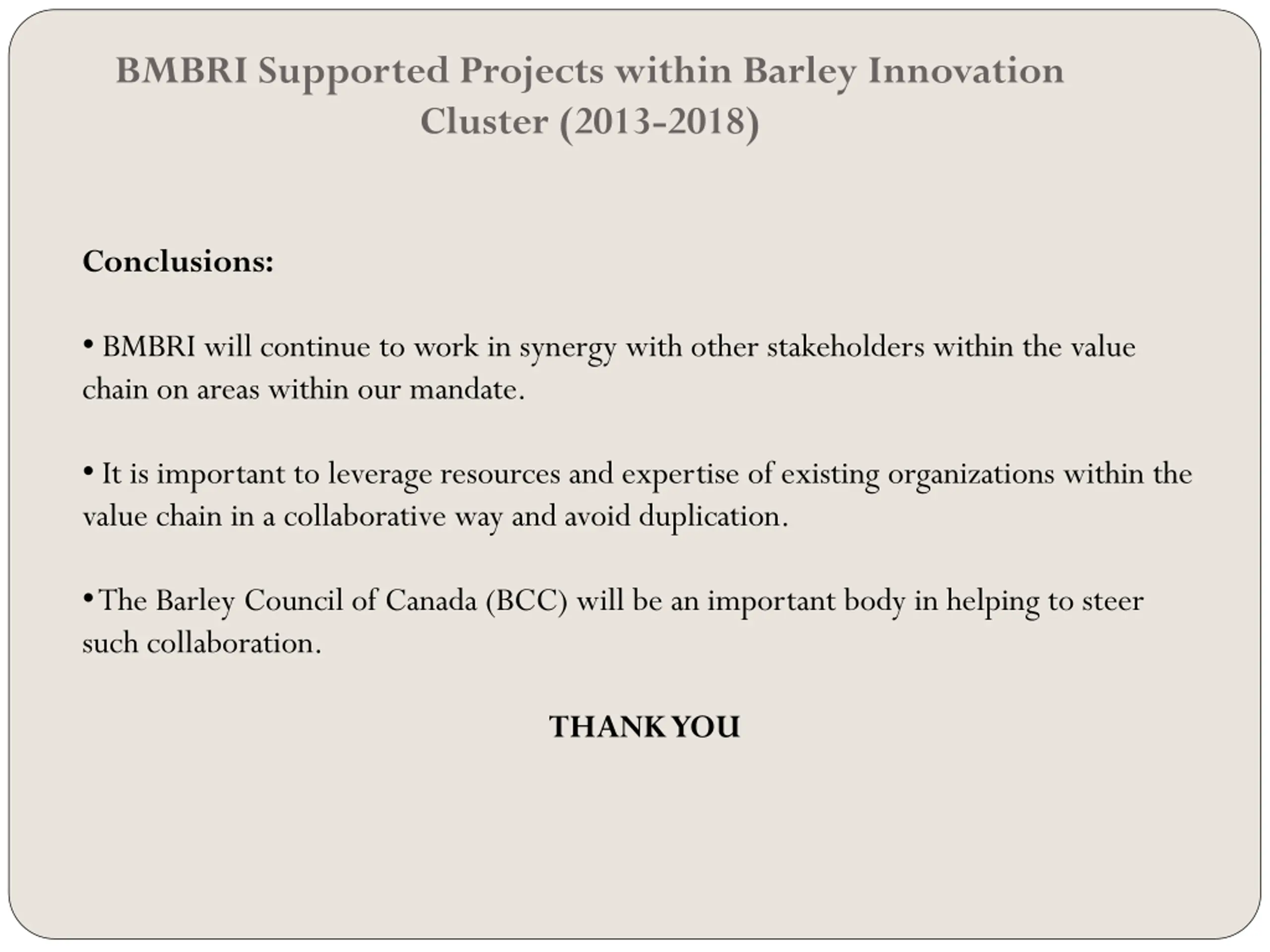BMBRI Supported Projects within Barley Innovation Cluster (2013-2018) Conclusions: BMBRI will continue to work in synergy with other stakeholders within the value chain on areas within our mandate. It is important to leverage resources and expertise of existing organizations within the value chain in a collaborative way and avoid duplication. The Barley Council of Canada (BCC) will be an important body in helping to steer such collaboration. THANK YOU