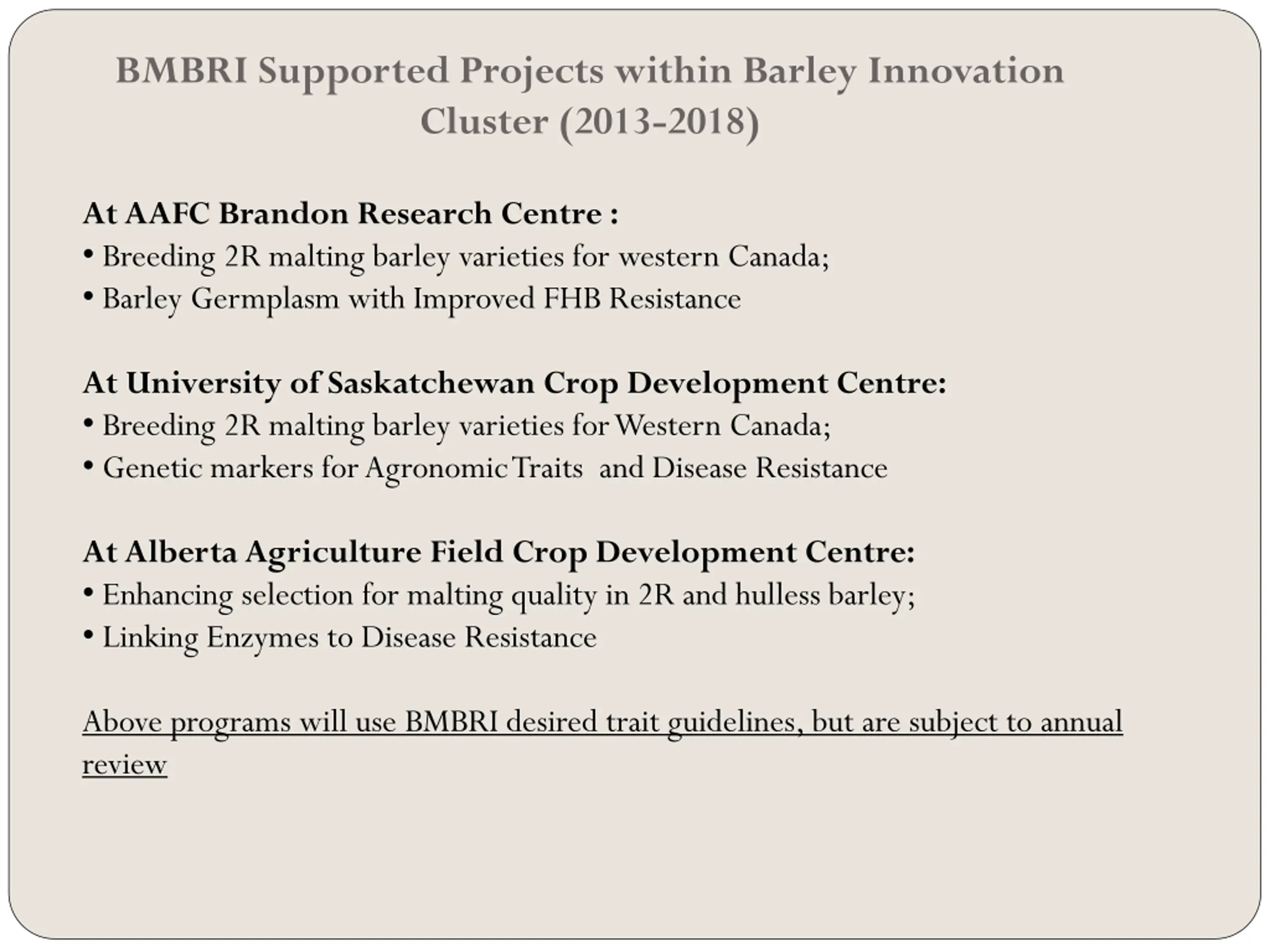 BMBRI Supported Projects within Barley Innovation Cluster (2013-2018) At AAFC Brandon Research Centre : Breeding 2R malting barley varieties for western Canada; Barley Germplasm with Improved FHB Resistance At University of Saskatchewan Crop Development Centre: Breeding 2R malting barley varieties for Western Canada; Genetic markers for Agronomic Traits and Disease Resistance At Alberta Agriculture Field Crop Development Centre: Enhancing selection for malting quality in 2R and hulless barley; Linking Enzymes to Disease Resistance Above programs will use BMBRI desired trait guidelines, but are subject to annual review