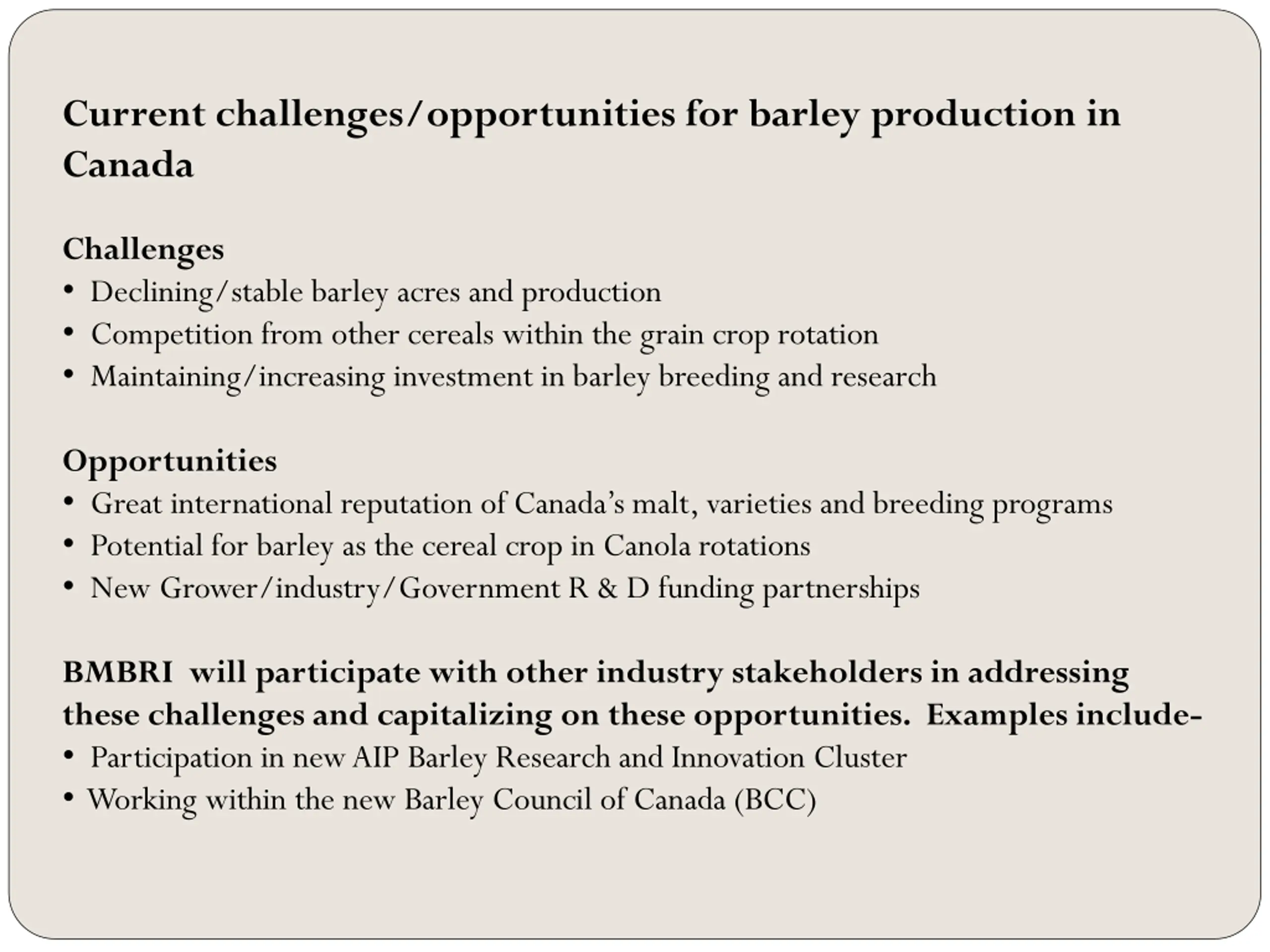 Current challenges/opportunities for barley production in Canada Challenges Declining/stable barley acres and production Competition from other cereals within the grain crop rotation Maintaining/increasing investment in barley breeding and research Opportunities Great international reputation of Canada s malt, varieties and breeding programs Potential for barley as the cereal crop in Canola rotations New Grower/industry/Government R & D funding partnerships BMBRI will participate with other industry stakeholders in addressing these challenges and capitalizing on these opportunities. Examples include- Participation in new AIP Barley Research and Innovation Cluster Working within the new Barley Council of Canada (BCC)