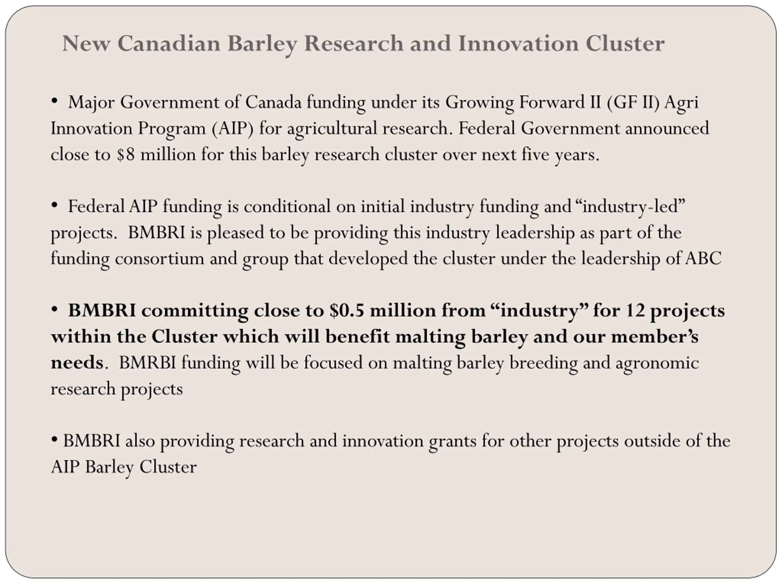 New Canadian Barley Research and Innovation Cluster Major Government of Canada funding under its Growing Forward II (GF II) Agri Innovation Program (AIP) for agricultural research. Federal Government announced close to $8 million for this barley research cluster over next five years. Federal AIP funding is conditional on initial industry funding and industry-led projects. BMBRI is pleased to be providing this industry leadership as part of the funding consortium and group that developed the cluster under the leadership of ABC BMBRI committing close to $0.5 million from industry for 12 projects within the Cluster which will benefit malting barley and our member s needs. BMRBI funding will be focused on malting barley breeding and agronomic research projects BMBRI also providing research and innovation grants for other projects outside of the AIP Barley Cluster