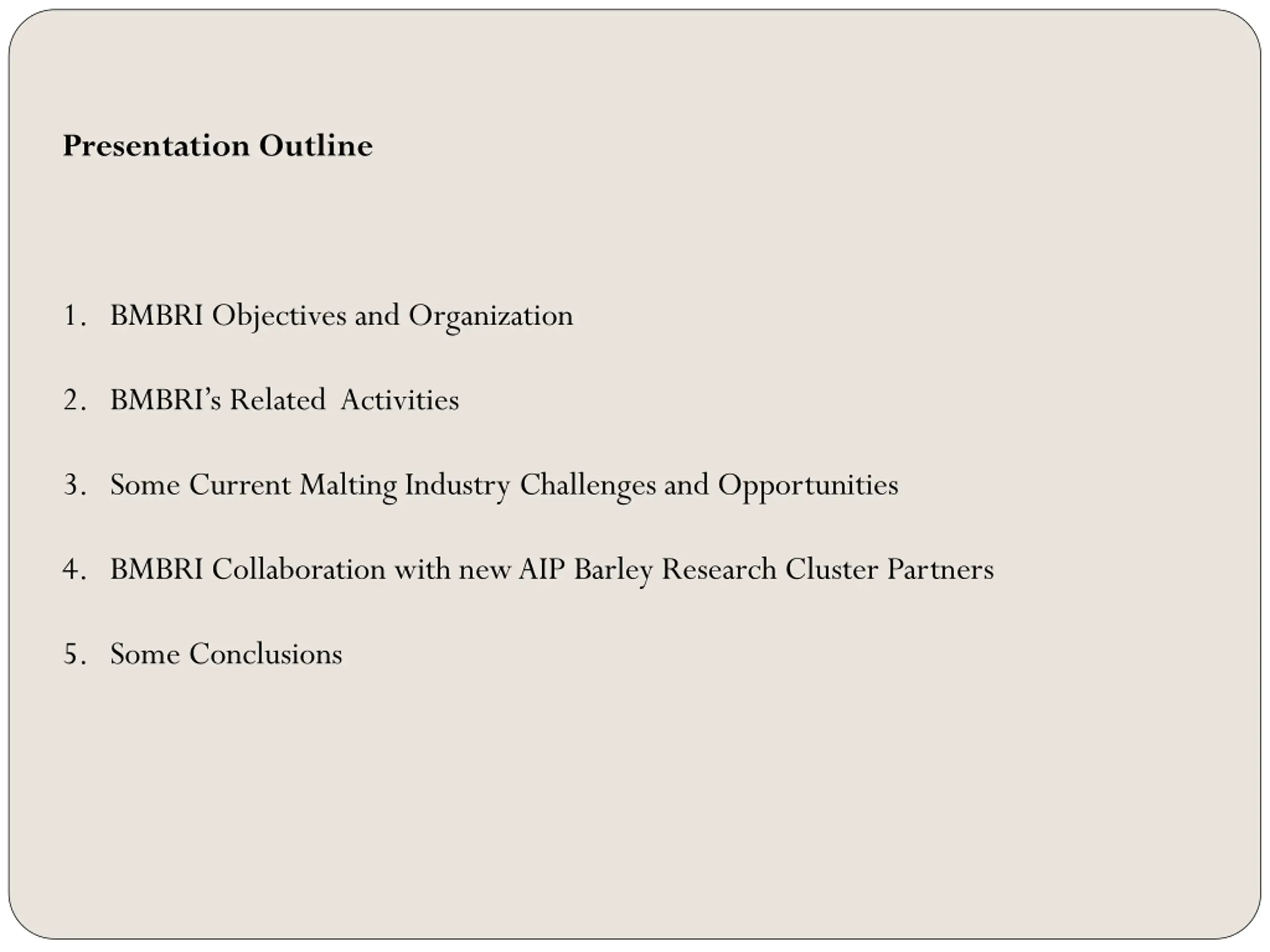 Presentation Outline 1. BMBRI Objectives and Organization 2. BMBRI s Related Activities 3. Some Current Malting Industry Challenges and Opportunities 4. BMBRI Collaboration with new AIP Barley Research Cluster Partners 5. Some Conclusions