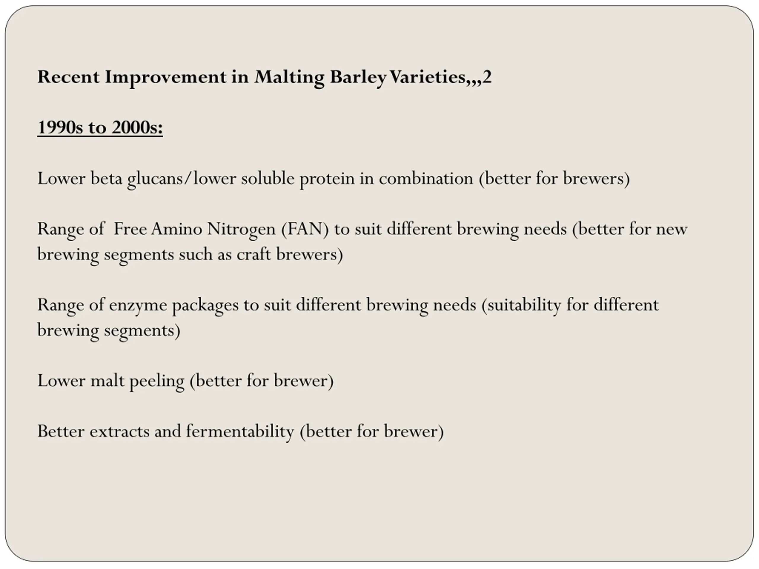Recent Improvement in Malting Barley Varieties,,,2 1990s to 2000s: Lower beta glucans/lower soluble protein in combination (better for brewers) Range of Free Amino Nitrogen (FAN) to suit different brewing needs (better for new brewing segments such as craft brewers) Range of enzyme packages to suit different brewing needs (suitability for different brewing segments) Lower malt peeling (better for brewer) Better extracts and fermentability (better for brewer)