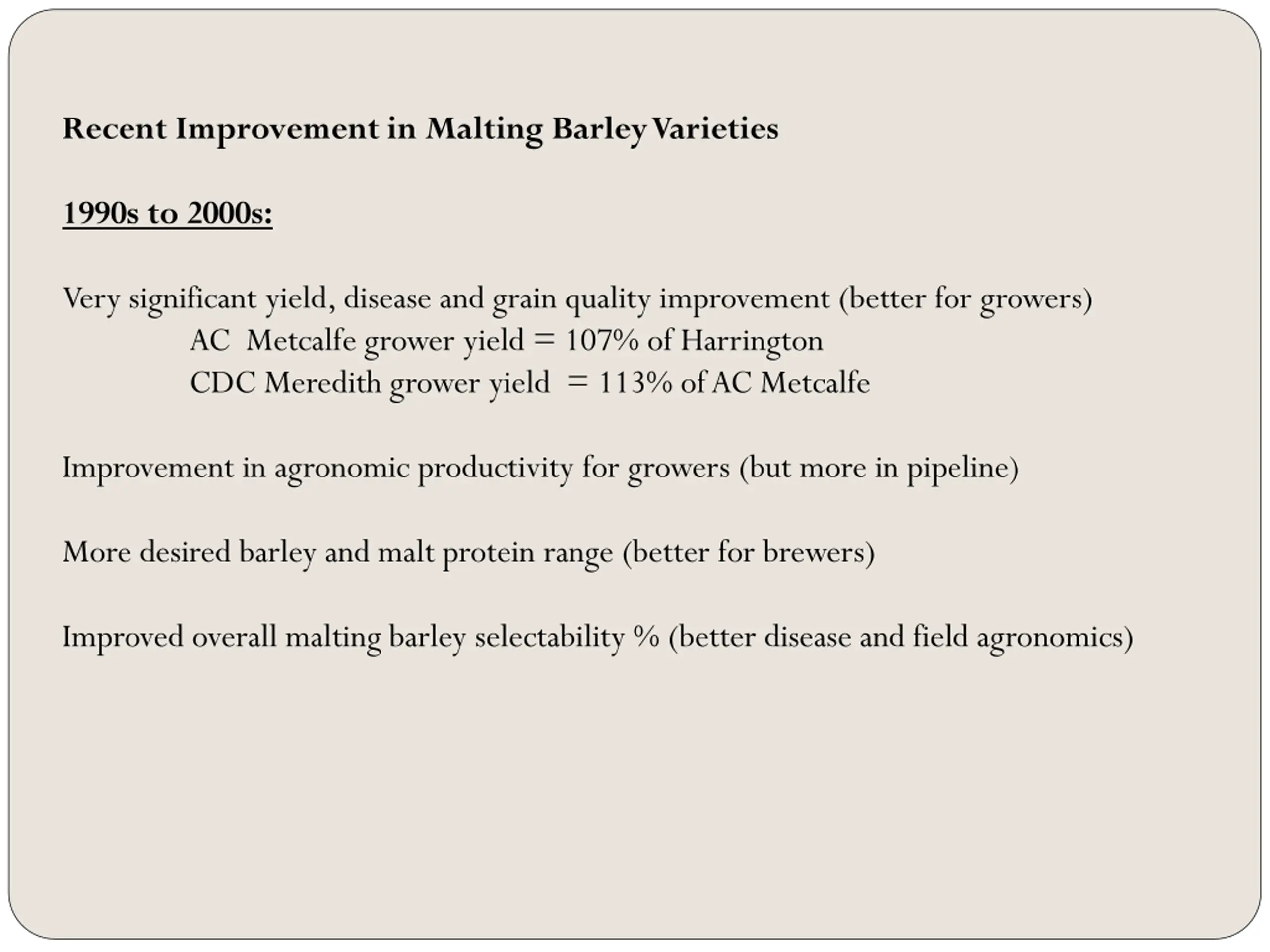 Recent Improvement in Malting Barley Varieties 1990s to 2000s: Very significant yield, disease and grain quality improvement (better for growers) AC Metcalfe grower yield = 107% of Harrington CDC Meredith grower yield = 113% of AC Metcalfe Improvement in agronomic productivity for growers (but more in pipeline) More desired barley and malt protein range (better for brewers) Improved overall malting barley selectability % (better disease and field agronomics)