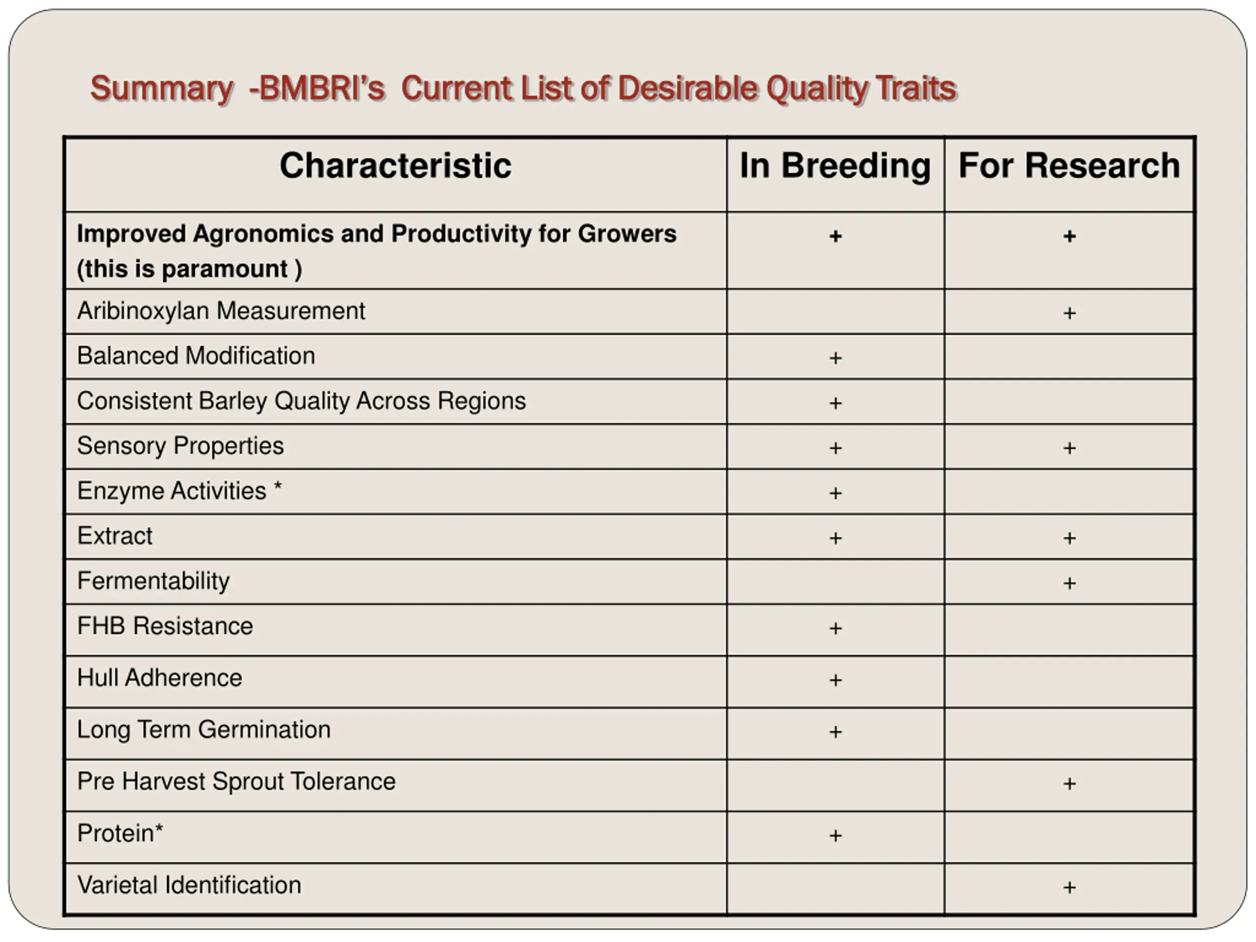 Summary Summary - -BMBRI s Current List of Desirable Quality Traits BMBRI s Current List of Desirable Quality Traits Characteristic In Breeding For Research Improved Agronomics and Productivity for Growers (this is paramount ) + + Aribinoxylan Measurement + Balanced Modification + Consistent Barley Quality Across Regions + Sensory Properties + + Enzyme Activities * + Extract + + Fermentability + FHB Resistance + Hull Adherence + Long Term Germination + Pre Harvest Sprout Tolerance + Protein* + Varietal Identification +