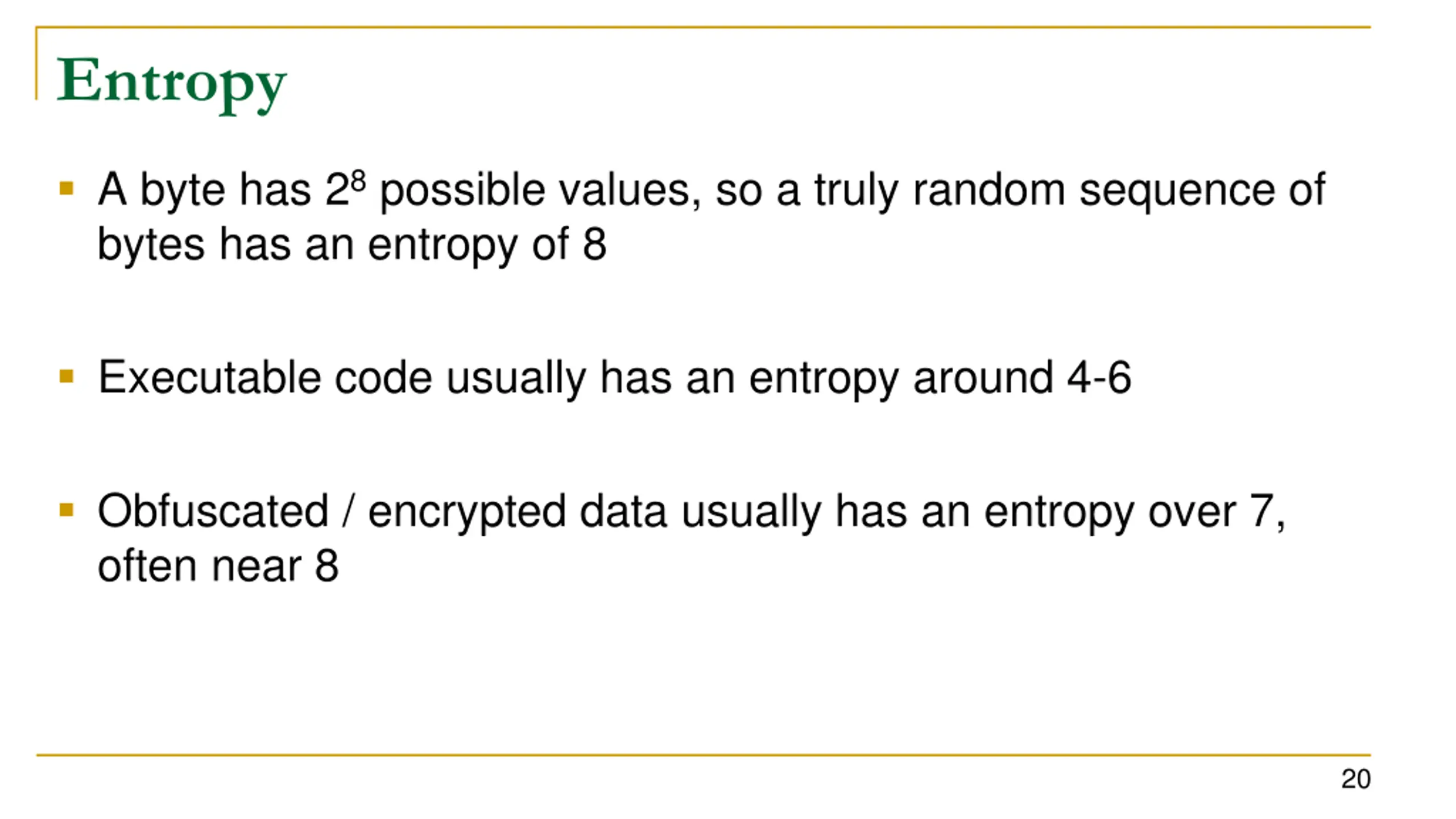 Entropy A byte has 28possible values, so a truly random sequence of bytes has an entropy of 8 Executable code usually has an entropy around 4-6 Obfuscated / encrypted data usually has an entropy over 7, often near 8 20
