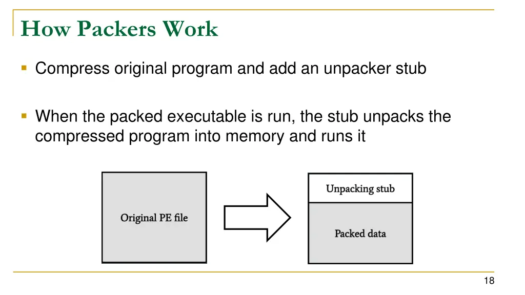 Packers Malware authors want to make it difficult for you to perform static analysis on their malware Use packers to hide: Executable code Strings Imports 17