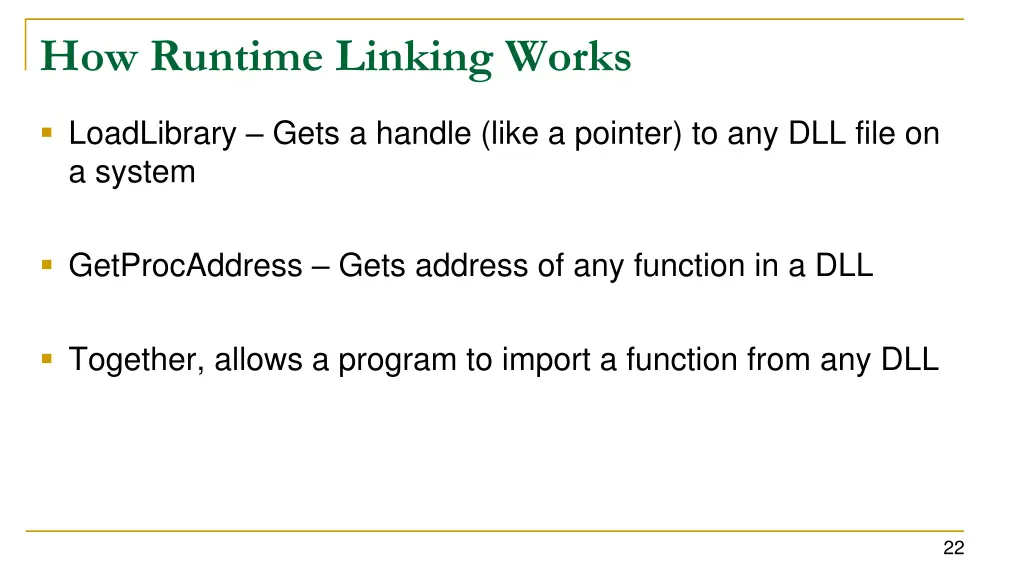 Runtime Linking Malware authors don t want you to be able to easily analyze a program s imports Can hide a file s imports until it is run by using runtime linking Resolves imports as the file runs Can import functions that are not listed in the IAT 21