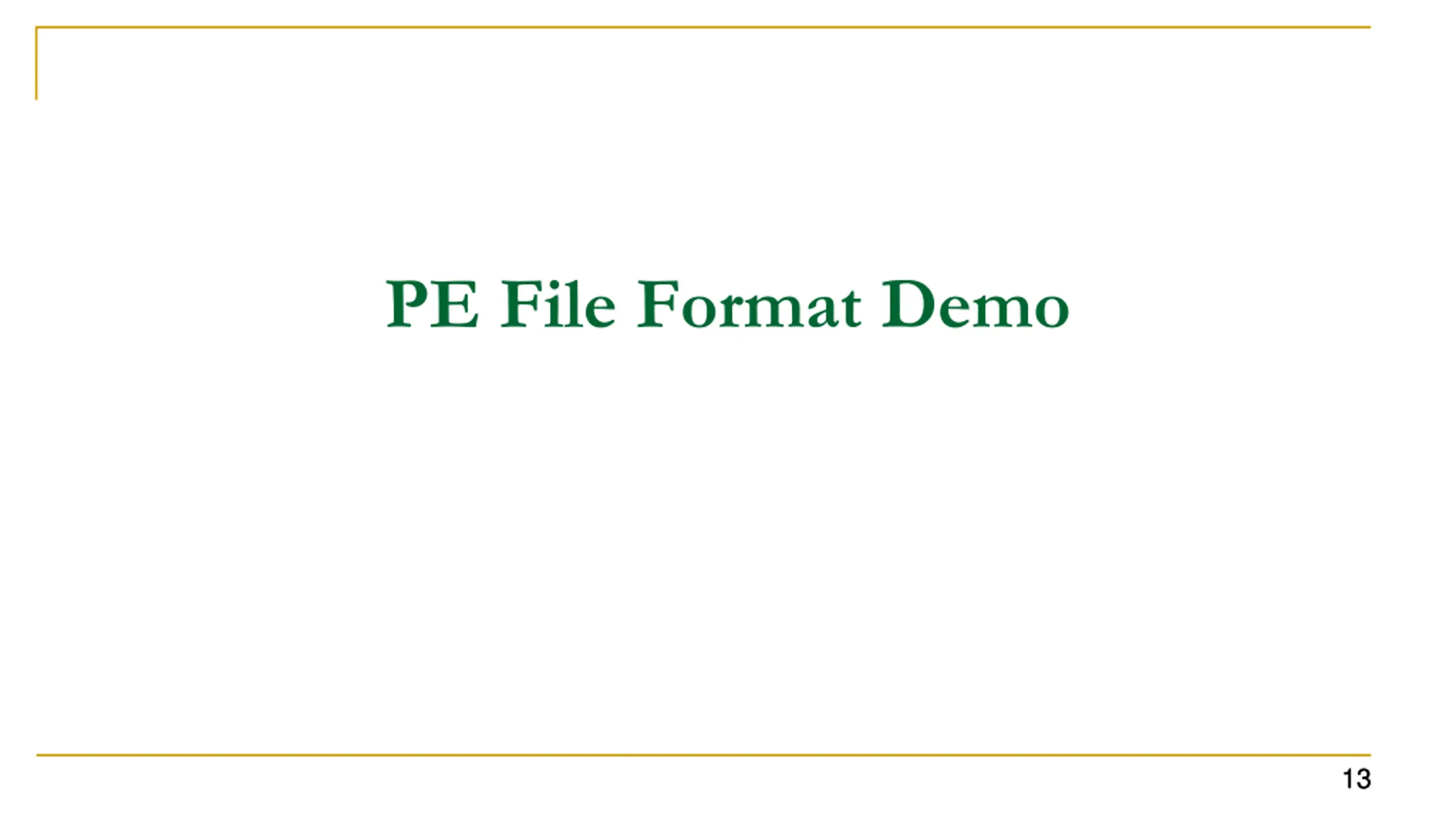 Common PE Sections Section name .text .data .idata .rsrc .rdata Contents Executable code Initialized data Import Address Table Resource Directory Table Read-only initialized data Many other common section names Unusual section names are a malicious indicator 12