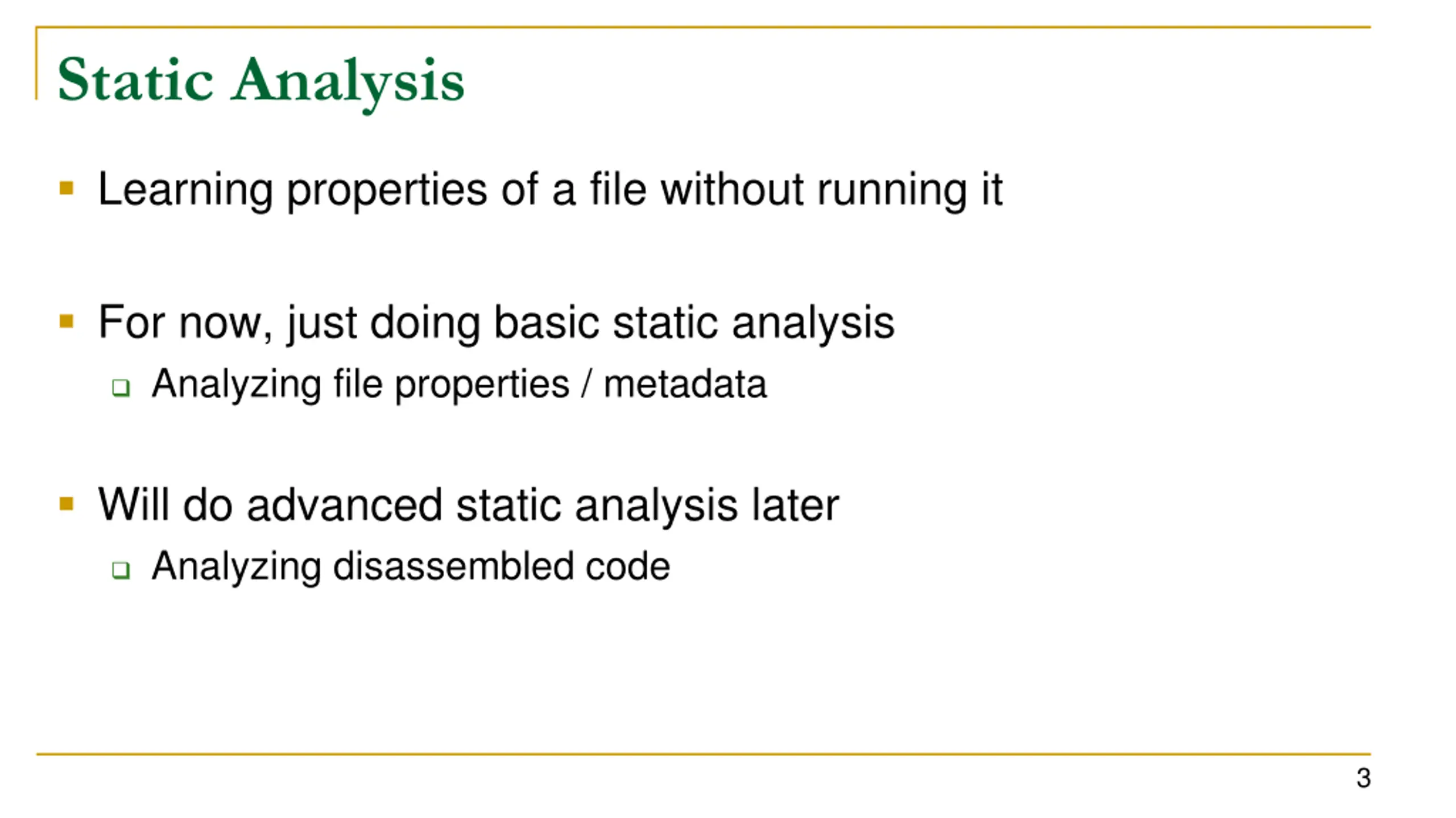 Static Analysis Learning properties of a file without running it For now, just doing basic static analysis Analyzing file properties / metadata Will do advanced static analysis later Analyzing disassembled code 3