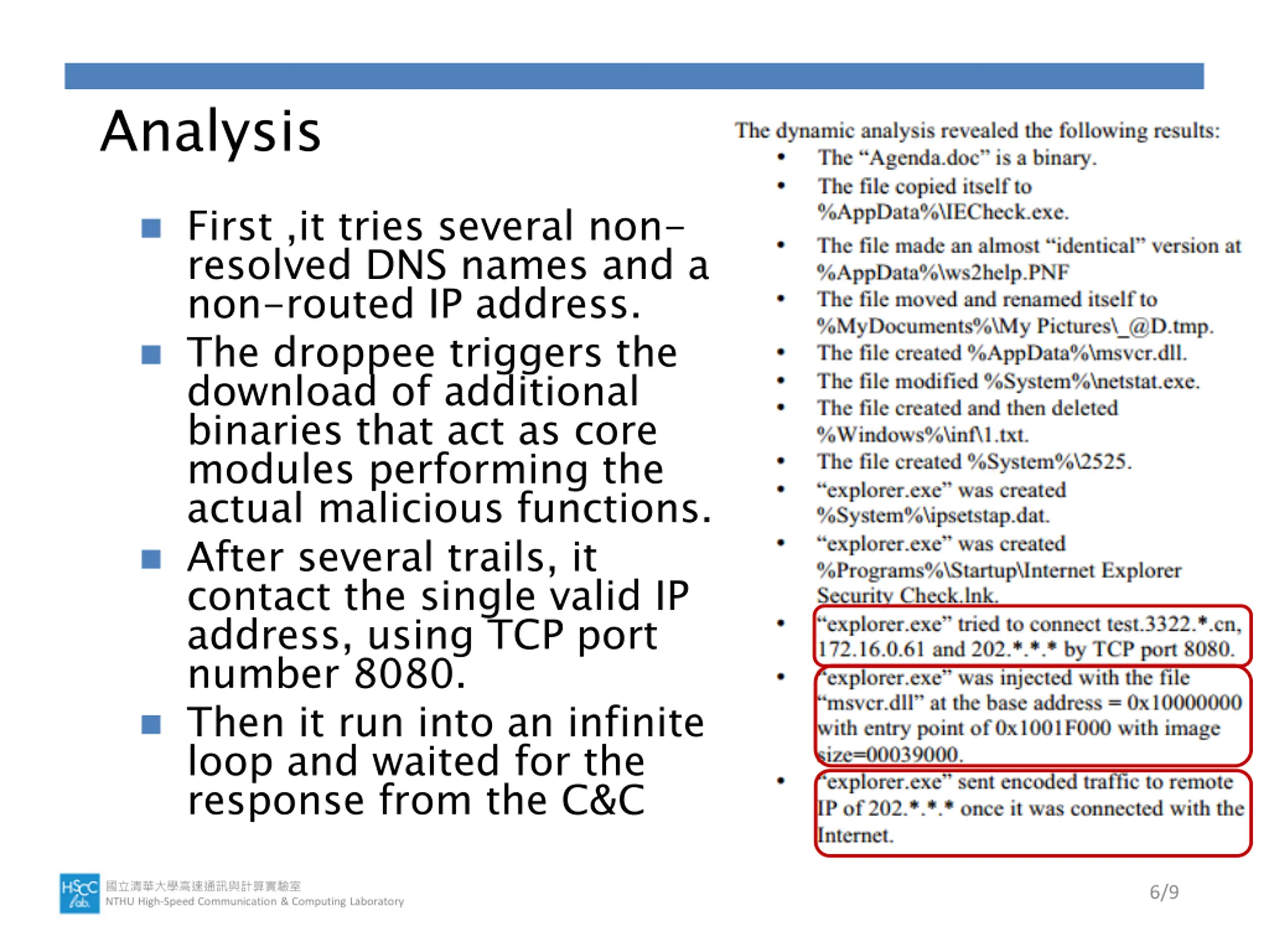 Analysis First ,it tries several non- resolved DNS names and a non-routed IP address. The droppee triggers the download of additional binaries that act as core modules performing the actual malicious functions. After several trails, it contact the single valid IP address, using TCP port number 8080. Then it run into an infinite loop and waited for the response from the C&C NTHU High-Speed Communication & Computing Laboratory 6/9