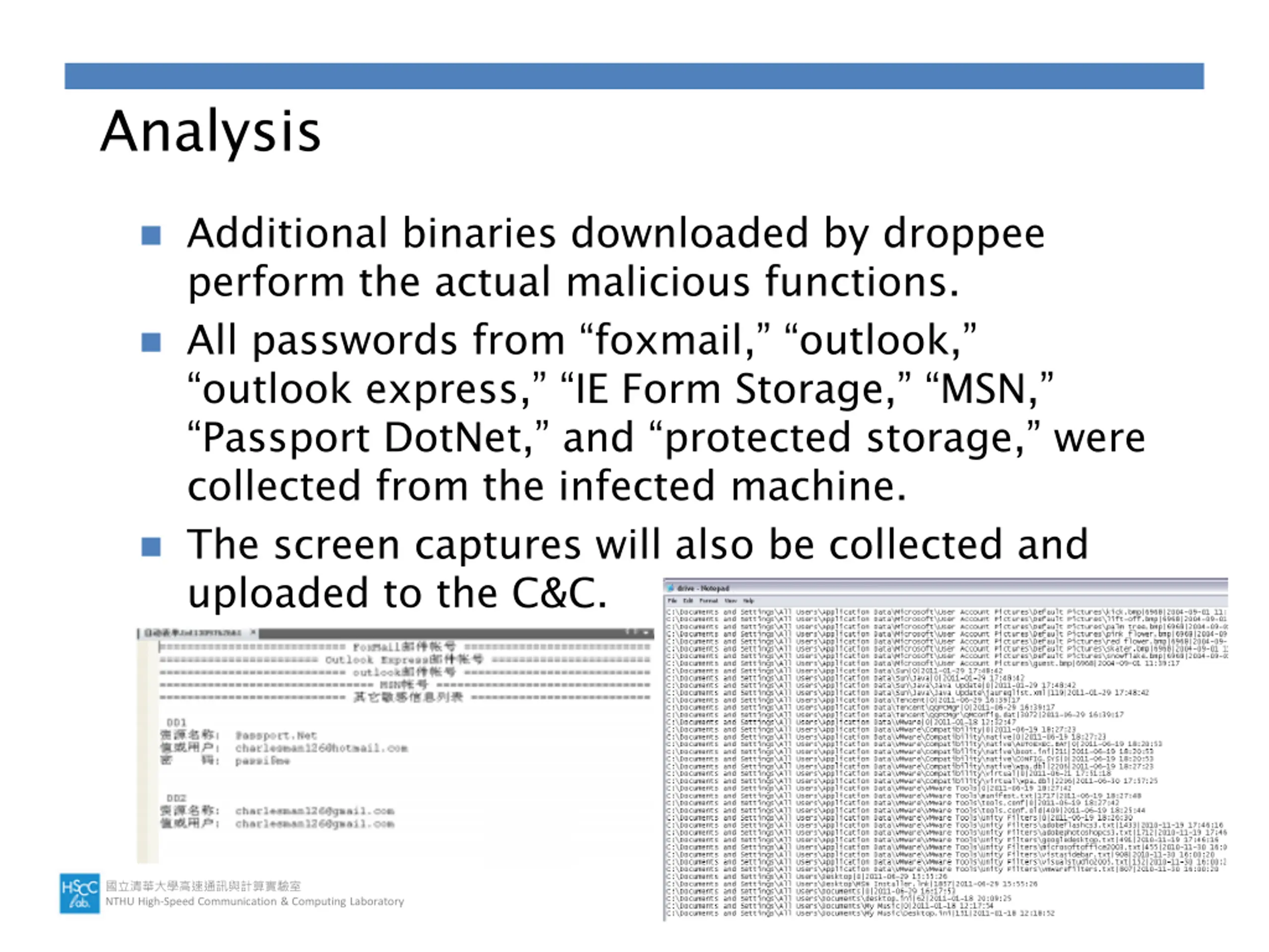 Analysis Additional binaries downloaded by droppee perform the actual malicious functions. All passwords from foxmail, outlook, outlook express, IE Form Storage, MSN, Passport DotNet, and protected storage, were collected from the infected machine. The screen captures will also be collected and uploaded to the C&C. NTHU High-Speed Communication & Computing Laboratory 7/9