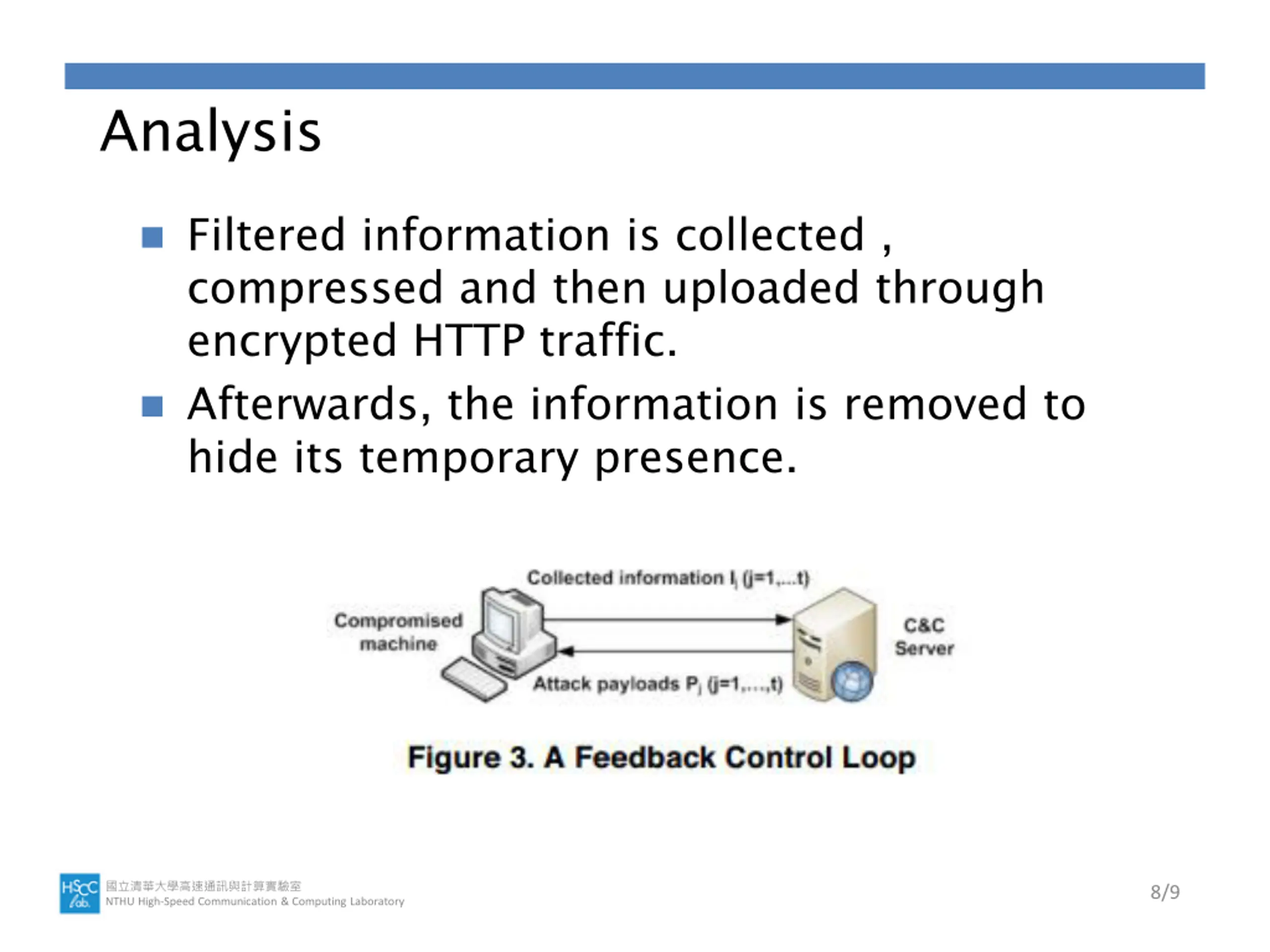 Analysis Filtered information is collected , compressed and then uploaded through encrypted HTTP traffic. Afterwards, the information is removed to hide its temporary presence. NTHU High-Speed Communication & Computing Laboratory 8/9