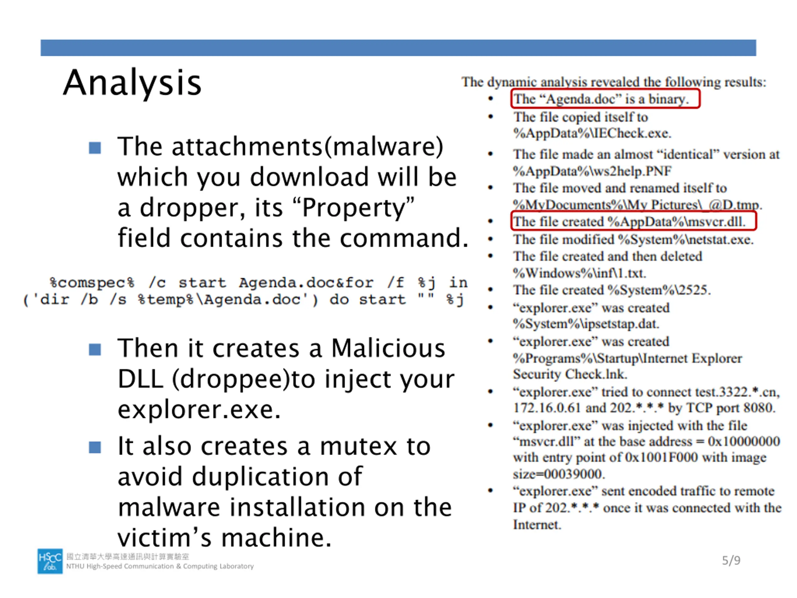 Analysis The attachments(malware) which you download will be a dropper, its Property field contains the command. Then it creates a Malicious DLL (droppee)to inject your explorer.exe. It also creates a mutex to avoid duplication of malware installation on the victim s machine. NTHU High-Speed Communication & Computing Laboratory 5/9