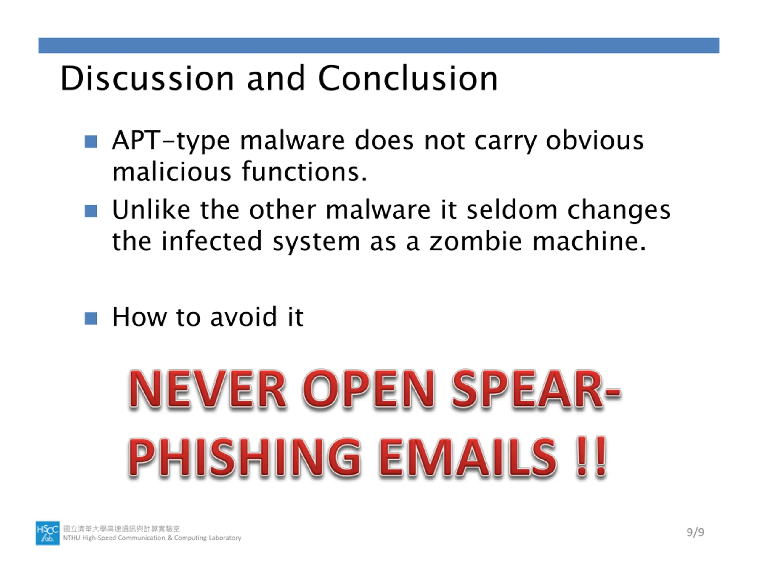 Discussion and Conclusion APT-type malware does not carry obvious malicious functions. Unlike the other malware it seldom changes the infected system as a zombie machine. How to avoid it NTHU High-Speed Communication & Computing Laboratory 9/9