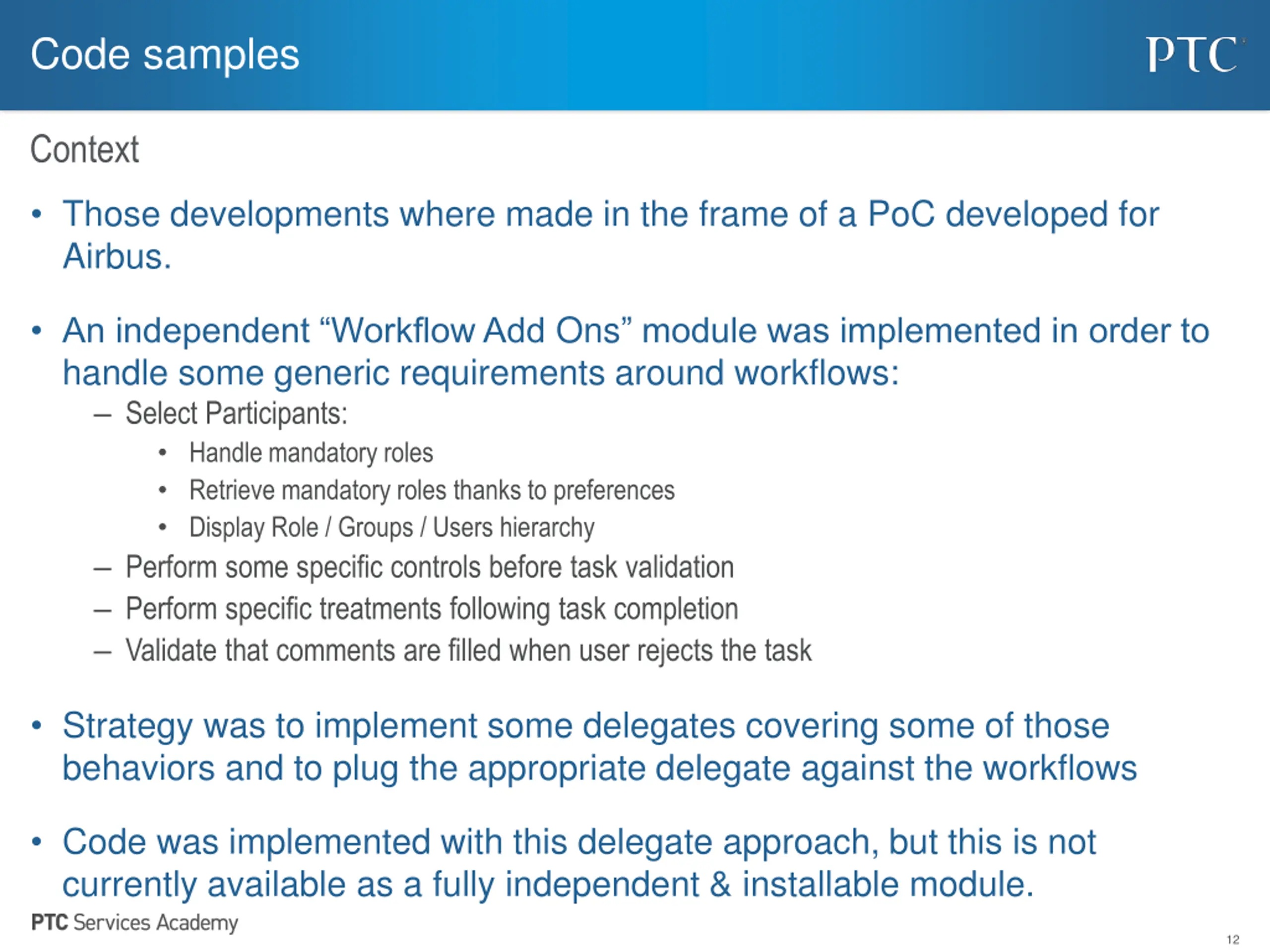 Code samples Context Those developments where made in the frame of a PoC developed for Airbus. An independent Workflow Add Ons module was implemented in order to handle some generic requirements around workflows: Select Participants: Handle mandatory roles Retrieve mandatory roles thanks to preferences Display Role / Groups / Users hierarchy Perform some specific controls before task validation Perform specific treatments following task completion Validate that comments are filled when user rejects the task Strategy was to implement some delegates covering some of those behaviors and to plug the appropriate delegate against the workflows Code was implemented with this delegate approach, but this is not currently available as a fully independent & installable module. 12