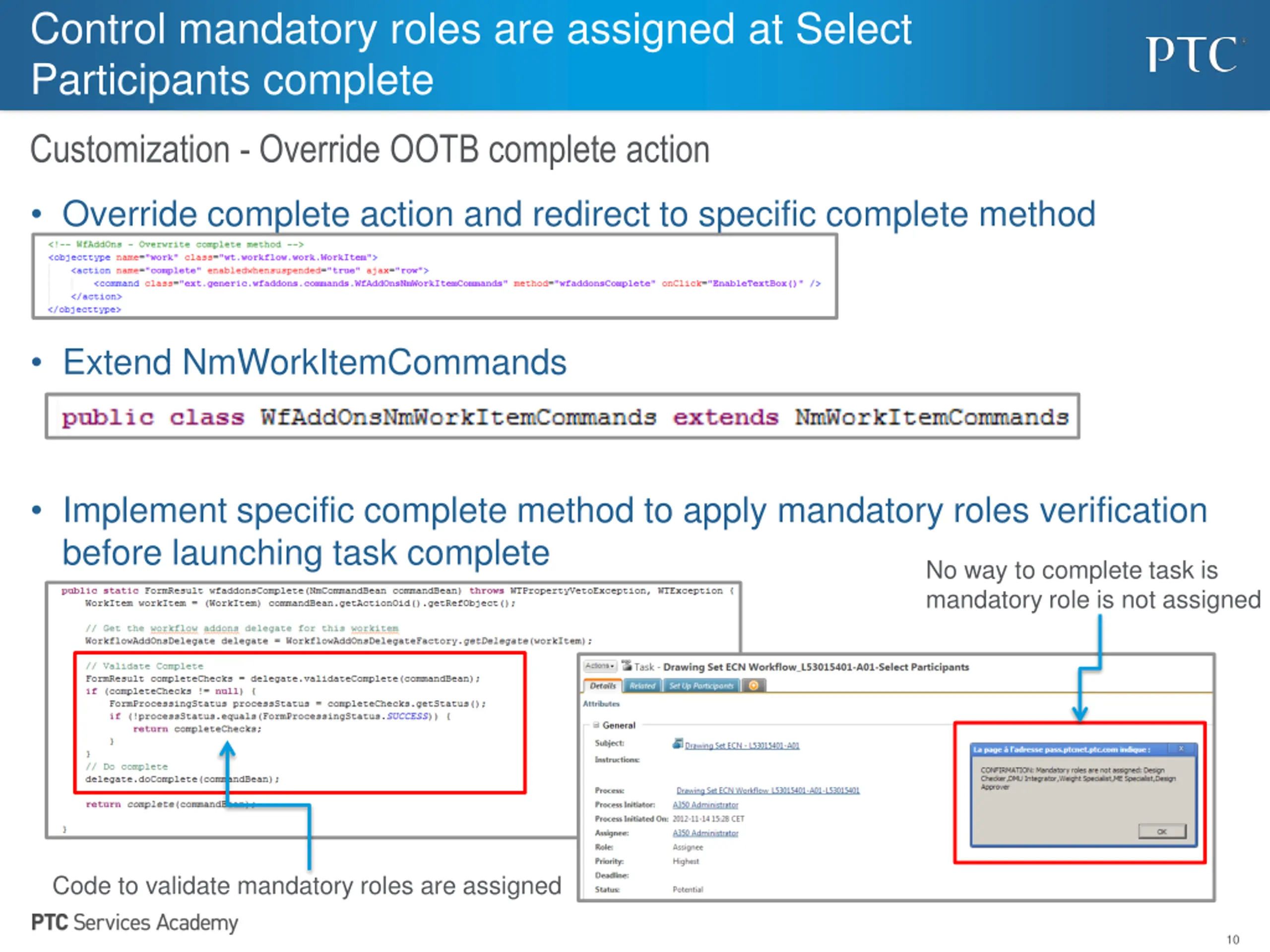Control mandatory roles are assigned at Select Participants complete Customization - Override OOTB complete action Override complete action and redirect to specific complete method Extend NmWorkItemCommands Implement specific complete method to apply mandatory roles verification before launching task complete No way to complete task is mandatory role is not assigned Code to validate mandatory roles are assigned 10