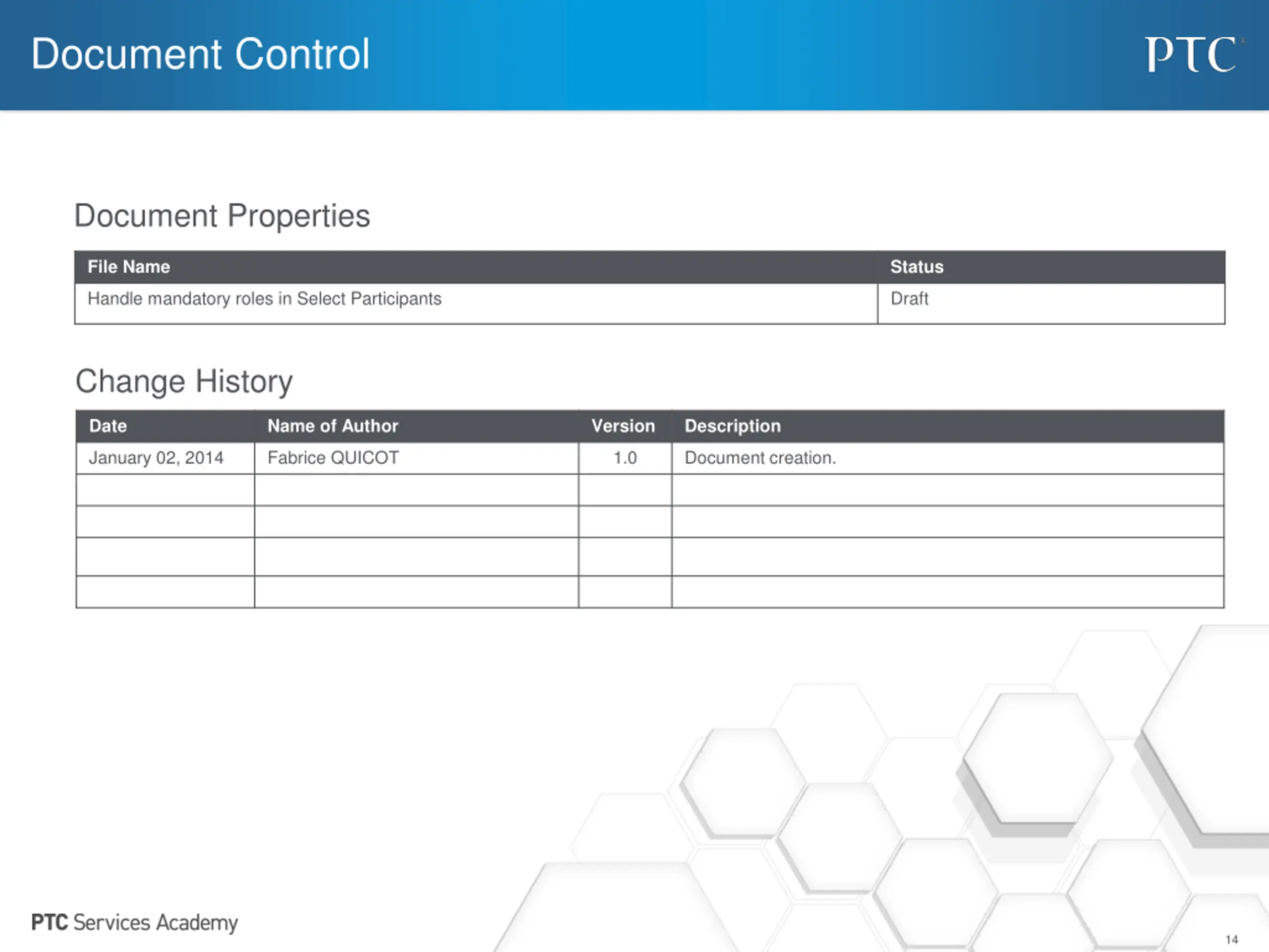 Document Control Document Properties File Name Status Handle mandatory roles in Select Participants Draft Change History Date Name of Author Version Description January 02, 2014 Fabrice QUICOT 1.0 Document creation. 14 14