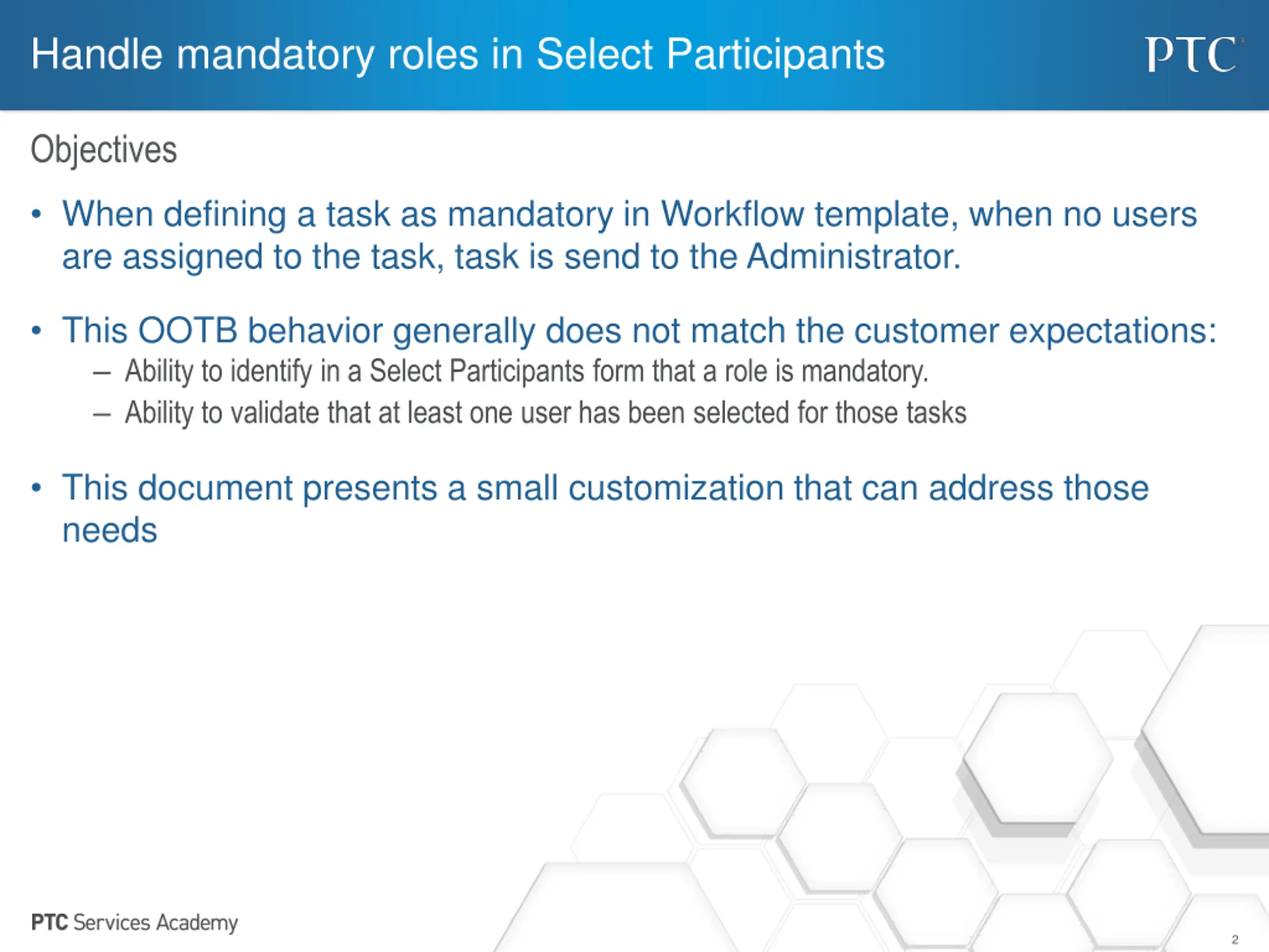Handle mandatory roles in Select Participants Objectives When defining a task as mandatory in Workflow template, when no users are assigned to the task, task is send to the Administrator. This OOTB behavior generally does not match the customer expectations: Ability to identify in a Select Participants form that a role is mandatory. Ability to validate that at least one user has been selected for those tasks This document presents a small customization that can address those needs 2 2