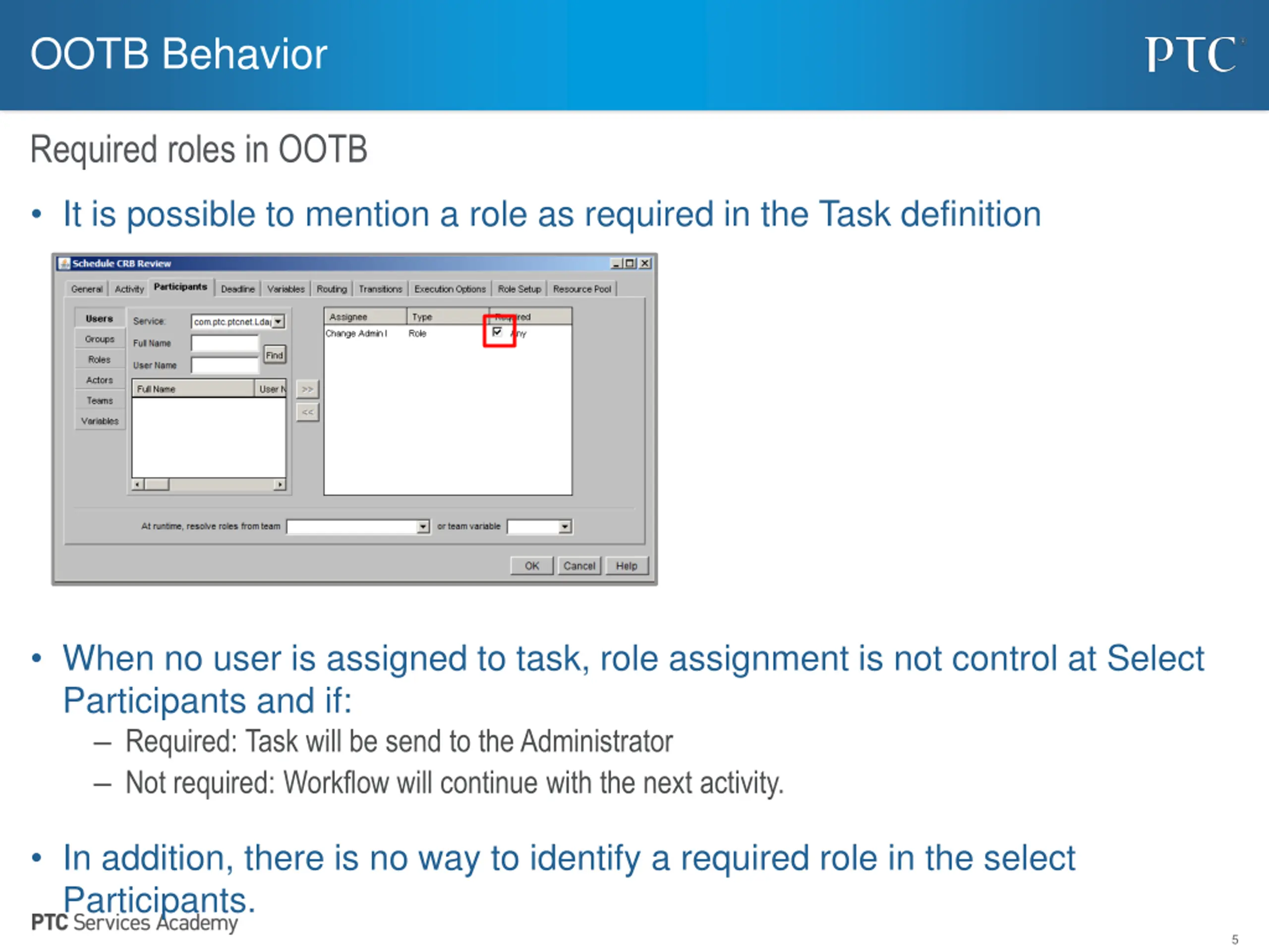 OOTB Behavior Required roles in OOTB It is possible to mention a role as required in the Task definition When no user is assigned to task, role assignment is not control at Select Participants and if: Required: Task will be send to the Administrator Not required: Workflow will continue with the next activity. In addition, there is no way to identify a required role in the select Participants. 5