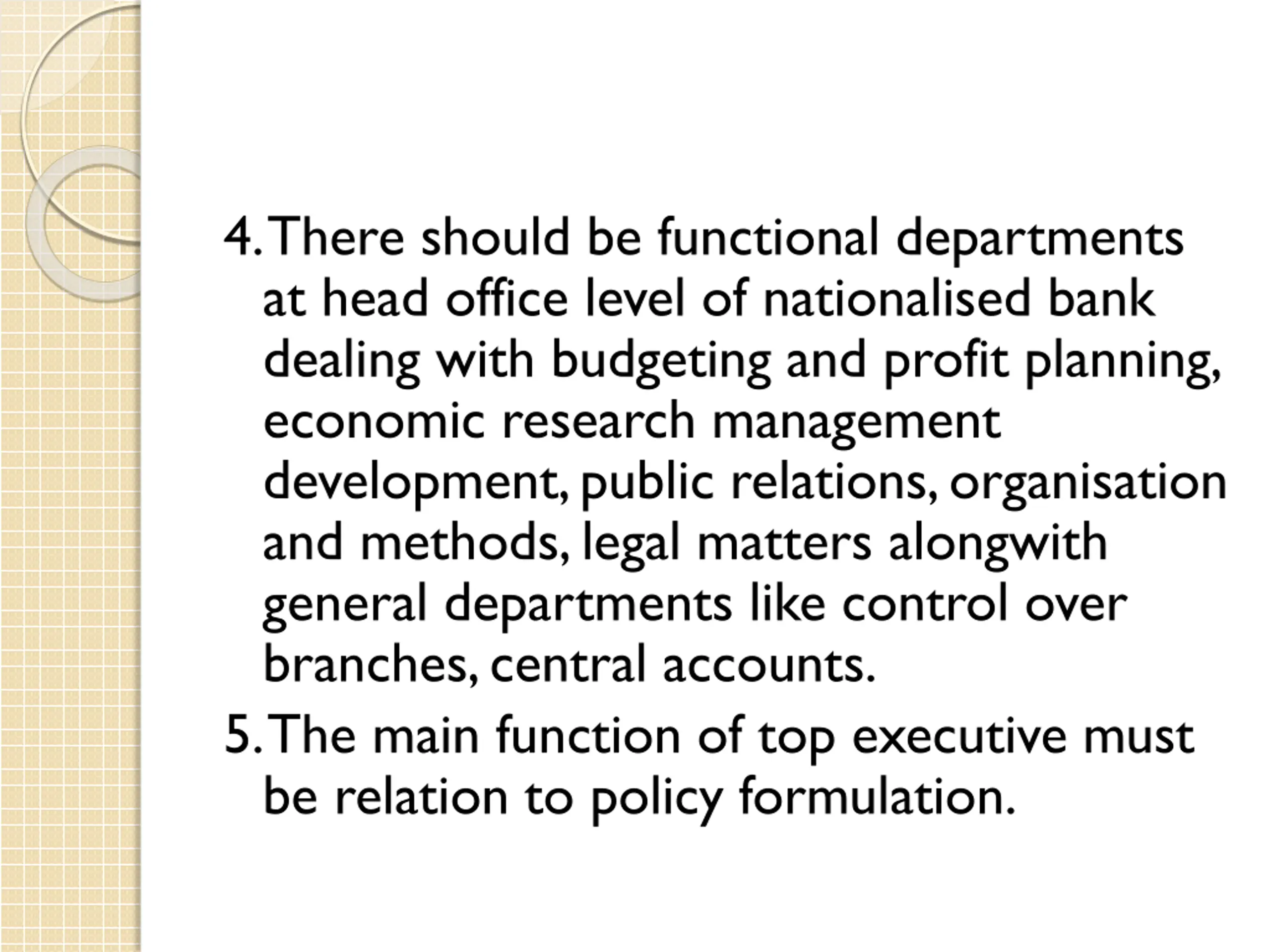 4. There should be functional departments at head office level of nationalised bank dealing with budgeting and profit planning, economic research management development, public relations, organisation and methods, legal matters alongwith general departments like control over branches, central accounts. 5. The main function of top executive must be relation to policy formulation.