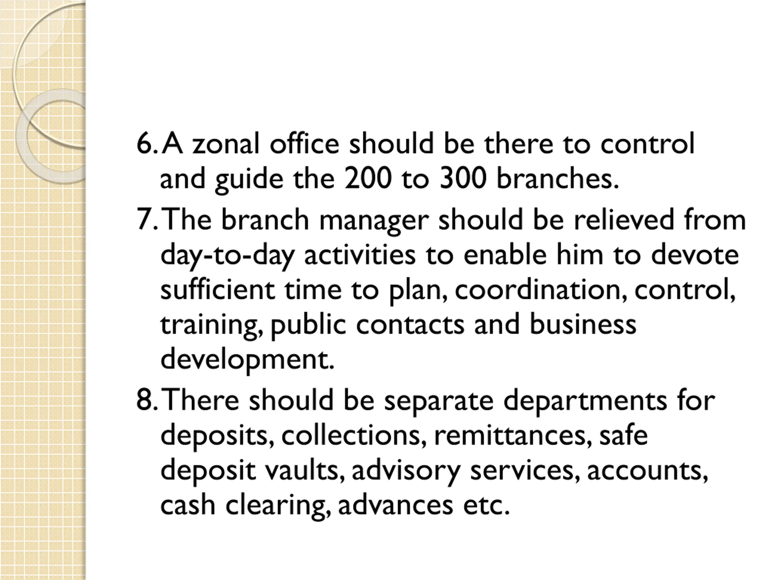 6. A zonal office should be there to control and guide the 200 to 300 branches. 7. The branch manager should be relieved from day-to-day activities to enable him to devote sufficient time to plan, coordination, control, training, public contacts and business development. 8. There should be separate departments for deposits, collections, remittances, safe deposit vaults, advisory services, accounts, cash clearing, advances etc.