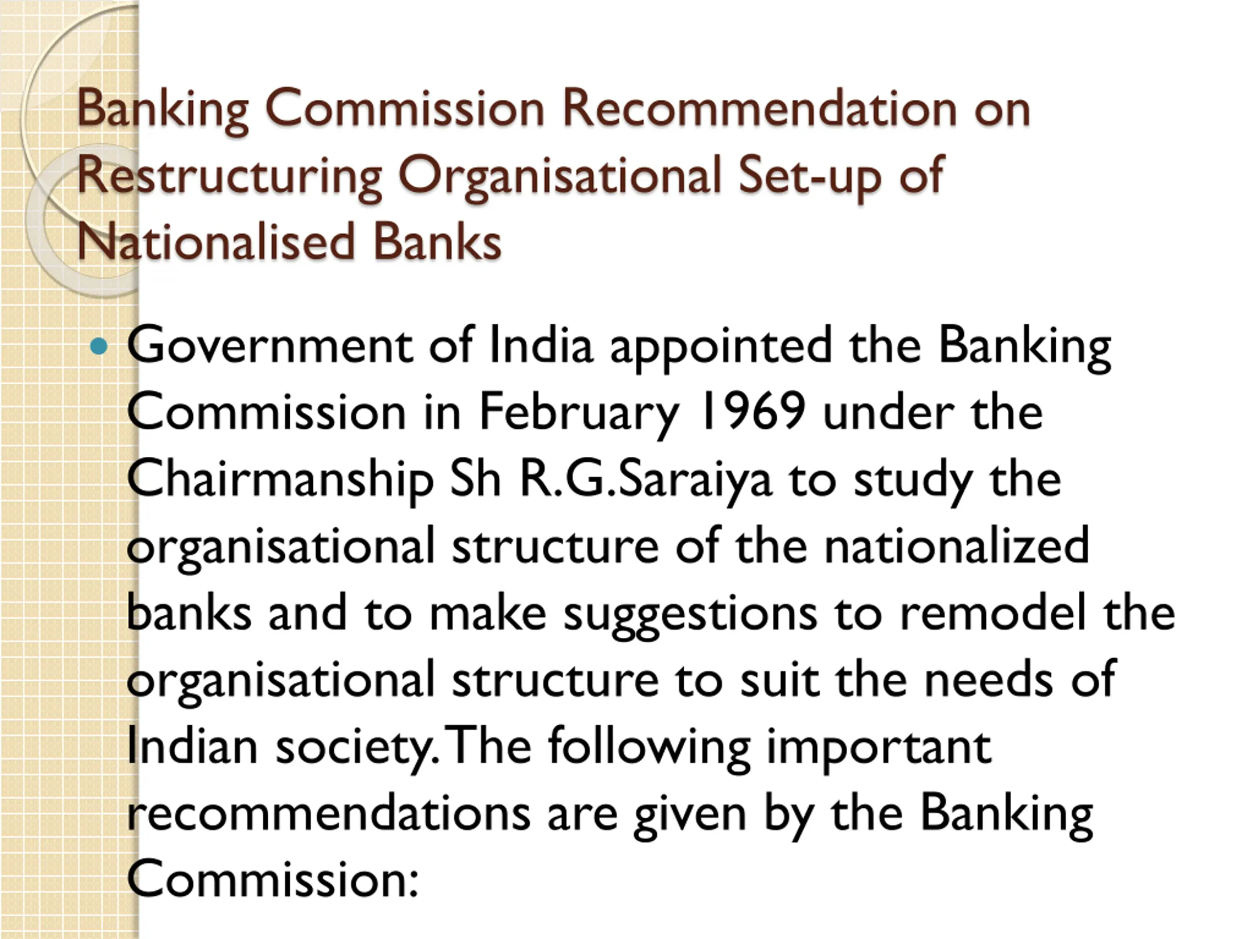 Banking Commission Recommendation on Restructuring Organisational Set-up of Nationalised Banks Government of India appointed the Banking Commission in February 1969 under the Chairmanship Sh R.G.Saraiya to study the organisational structure of the nationalized banks and to make suggestions to remodel the organisational structure to suit the needs of Indian society. The following important recommendations are given by the Banking Commission: